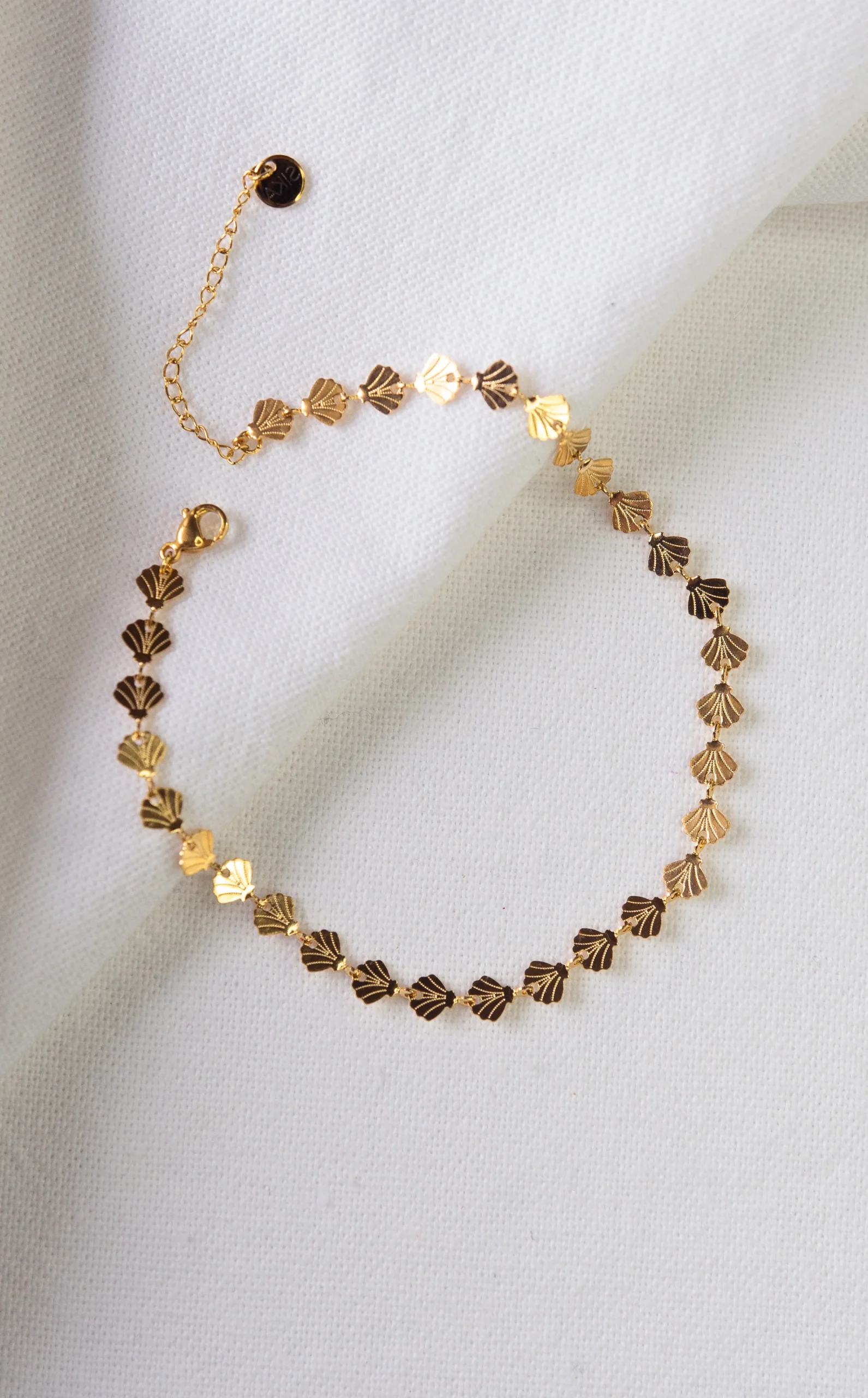 La chaine de cheville Marina est fabriquée à la main dans mon atelier, Elle est composée d’une chaine décorée d’un motif de coquillages,