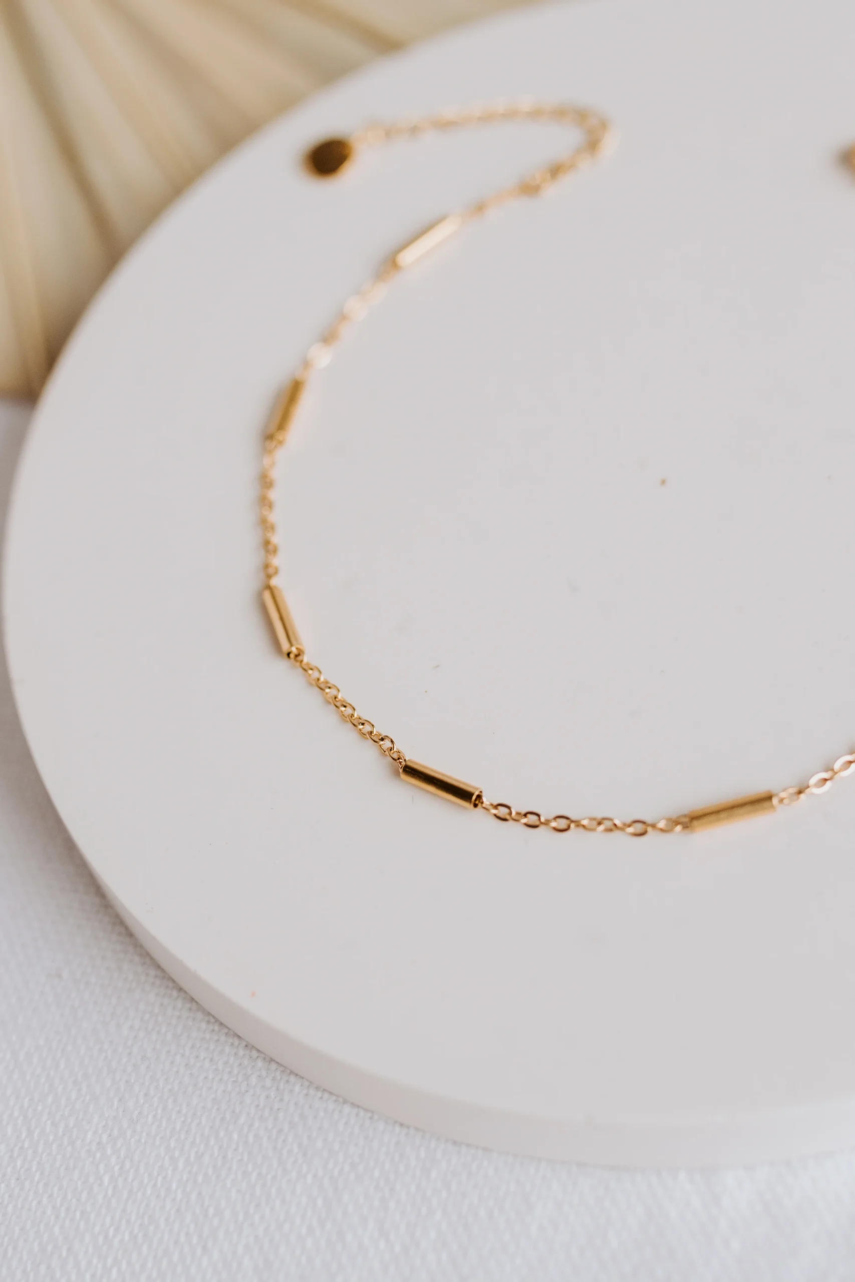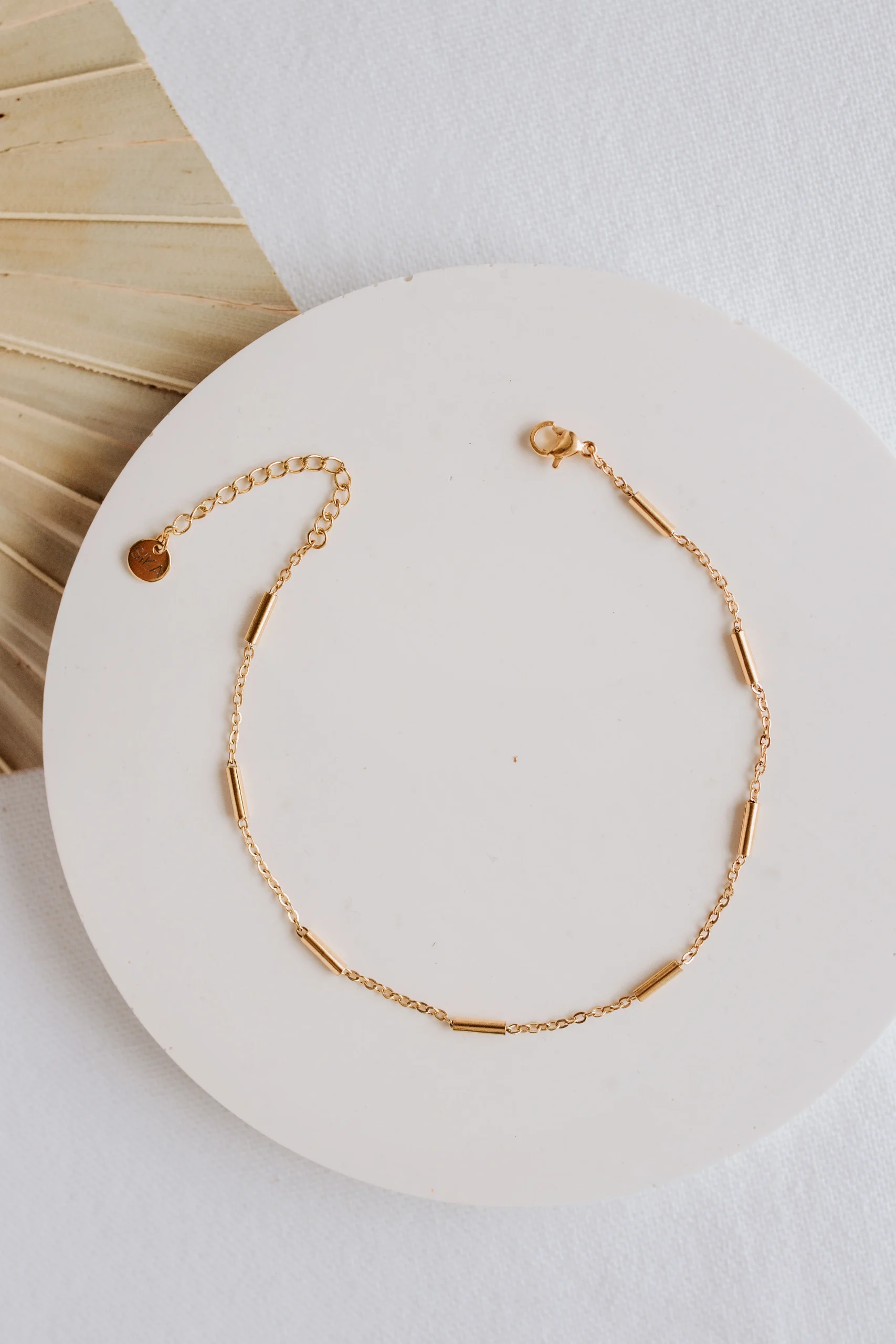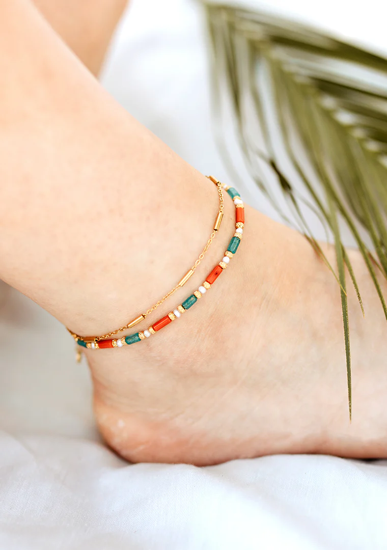 La chaîne de cheville Mila est fabriquée à la main dans mon atelier, Elle est composée d’une fine chaîne aux maillons décorés de tubes dorés,