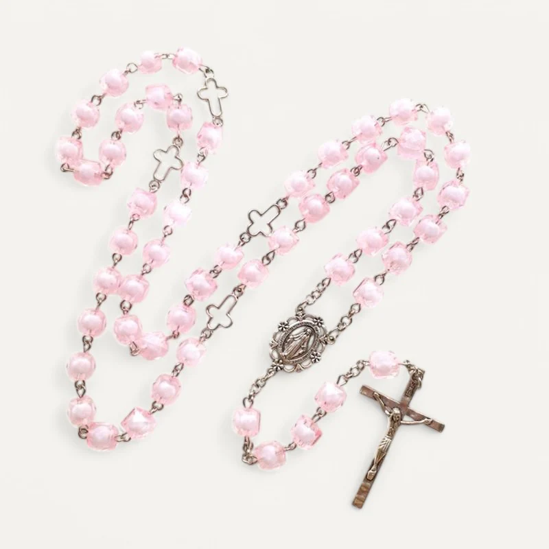 Les perles de ce chapelet sont d’un rose doux et apaisant, évoquant la tendresse et l’amour divin. La couleur rose est souvent associée à la dévotion et à la compassion.