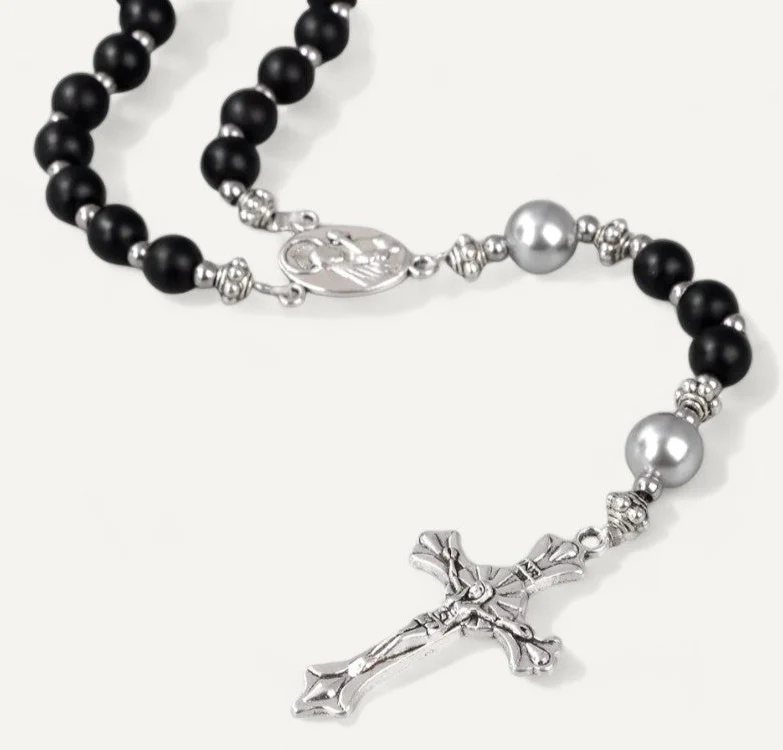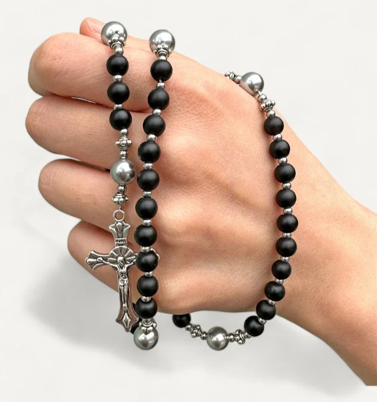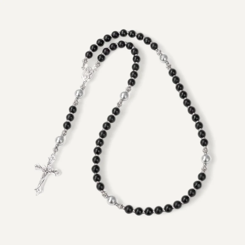 Ce chapelet chrétien, alliant des perles noires lustrées à des éléments argentés délicats, est un véritable symbole de piété empreint d’élégance. Idéal pour exprimer sa foi, il se porte comme un accessoire raffiné qui complète avec grâce toute tenue vestimentaire.