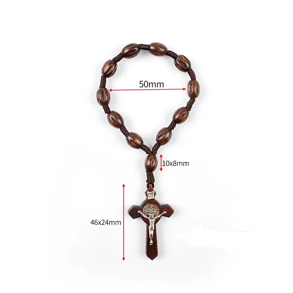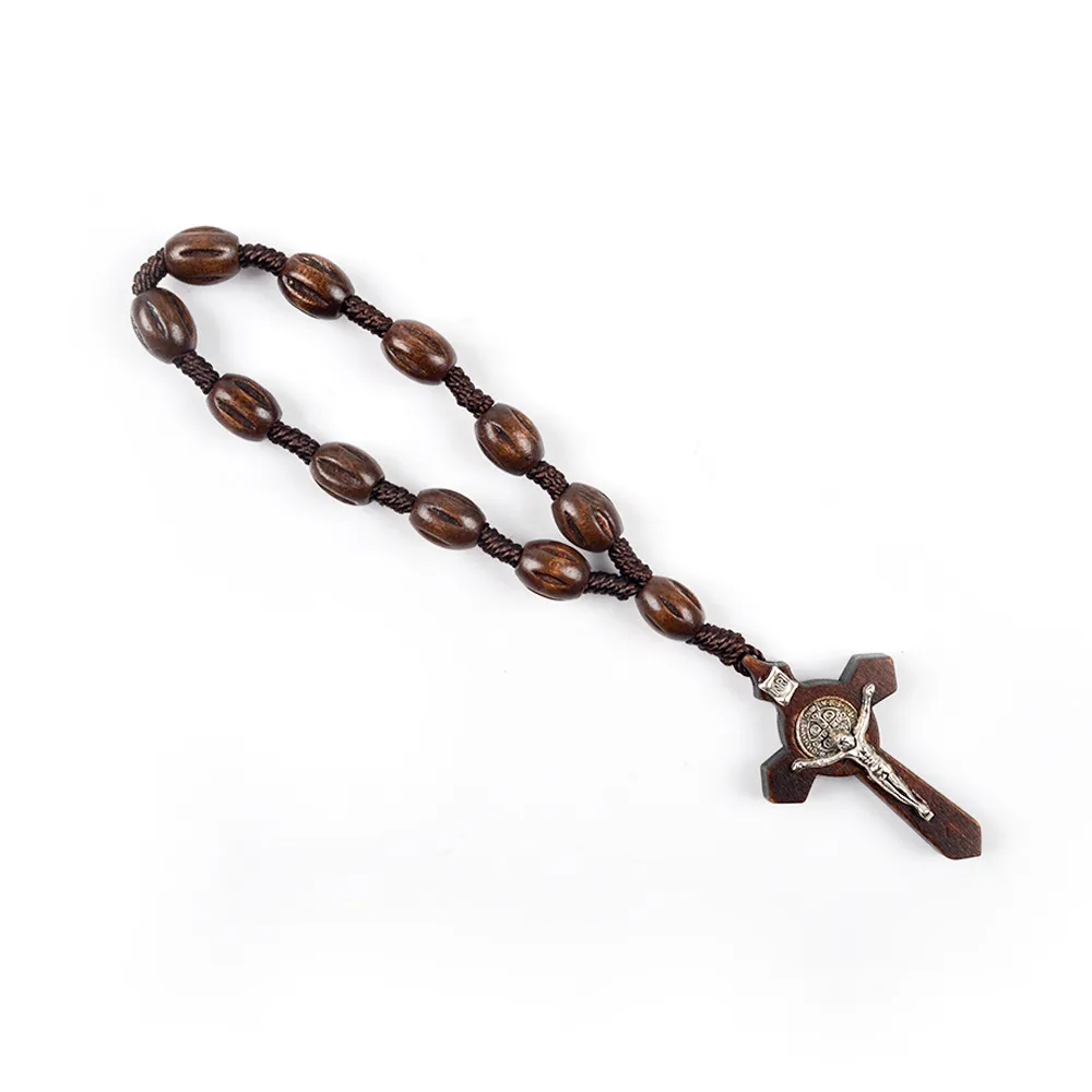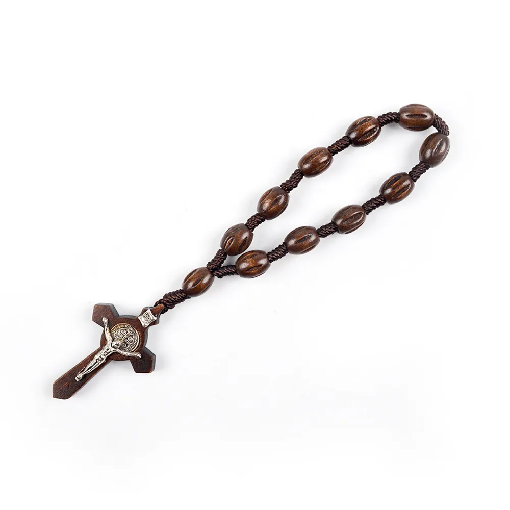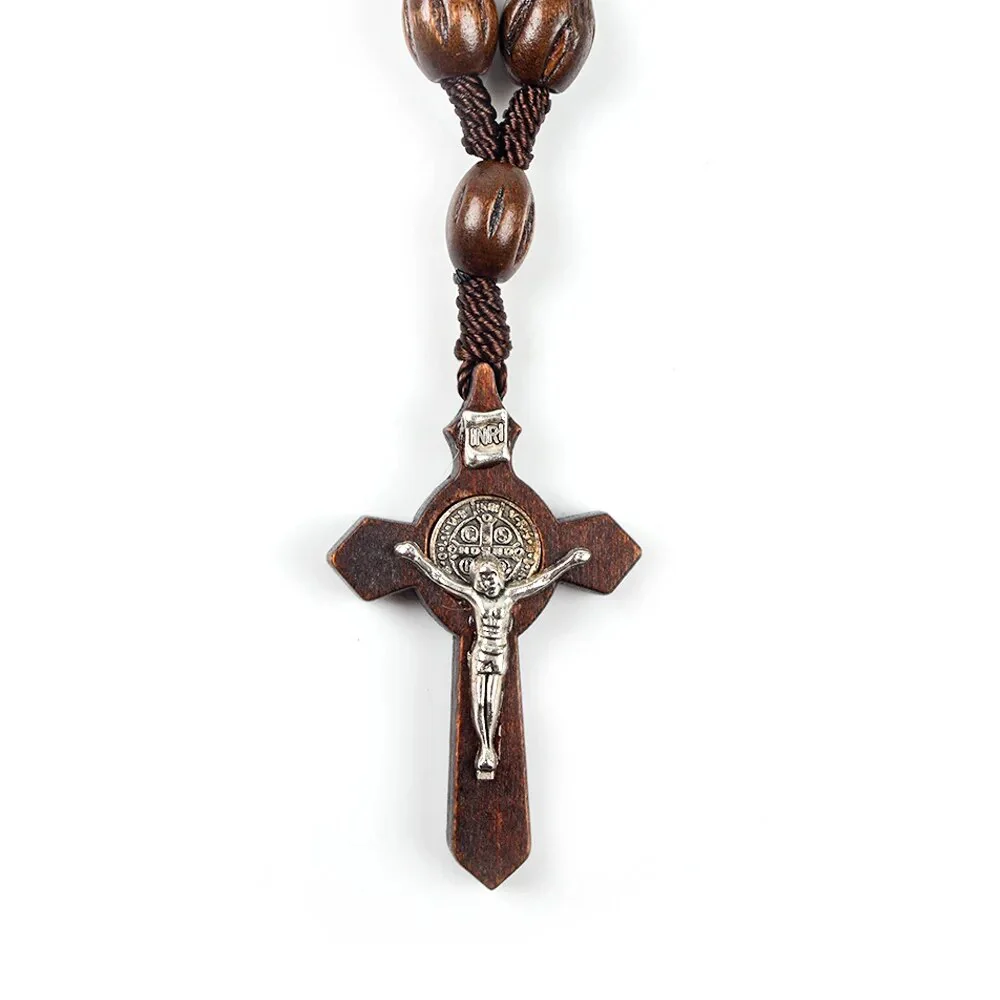 Chaque perle en bois brun poli est reliée par un cordon solide, conduisant à une croix en bois sombre incrustée d’un Christ en argent sterling. Au centre, la médaille richement détaillée en argent sterling rehausse l’ensemble avec une touche d’éclat.