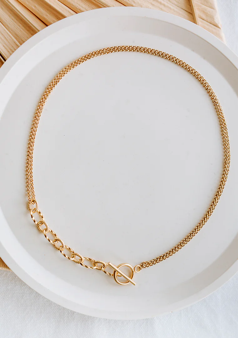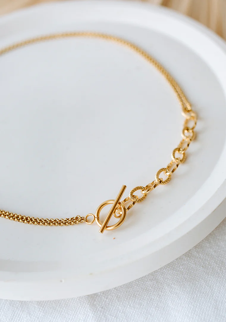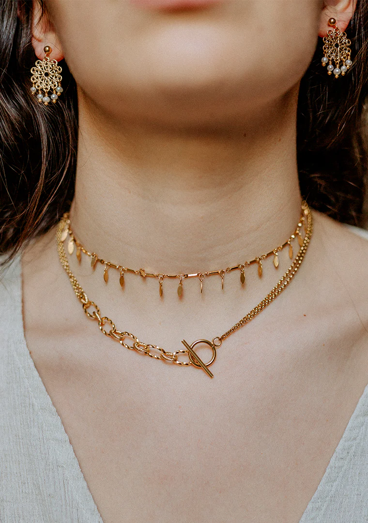 Le collier Alicia est fabriqué à la main dans mon atelier, Il est composé d’une chaine aux maillons asymétriques, doublée d’une chaine aux maillons ronds, ainsi que d’un fermoir bâton,