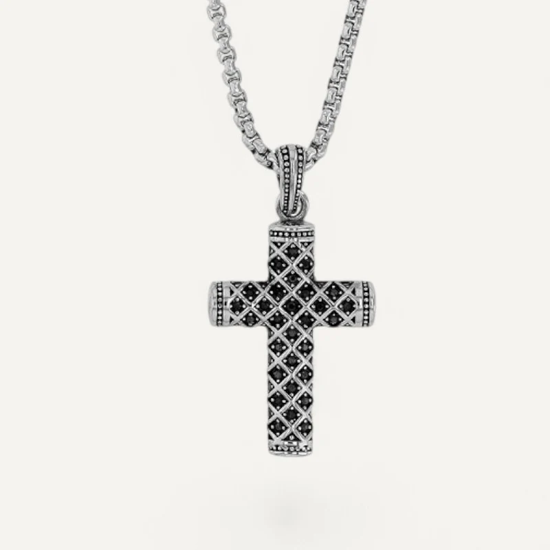 Le pendentif croix, orné de motifs géométriques fins et de pierres noires, offre une allure sophistiquée et pleine de caractère. Ce bijou unique est parfait pour les hommes qui souhaitent afficher leur foi avec un accessoire moderne et élégant.