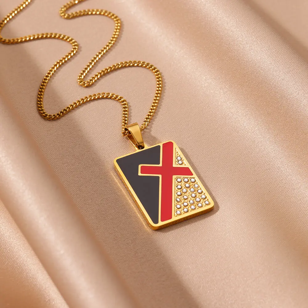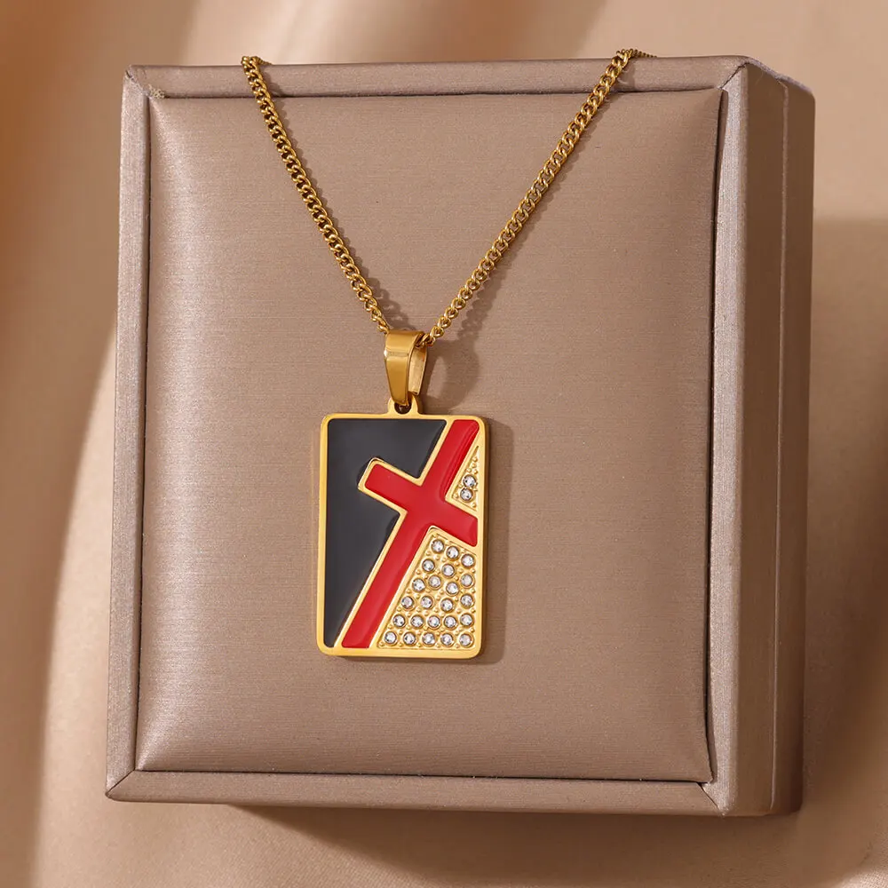 Ce collier croix moderne en acier inoxydable doré est bien plus qu’un simple bijou. Conçu pour ceux qui cherchent à afficher leur foi avec élégance, ce pendentif rectangulaire est orné d’une croix rouge contrastant magnifiquement avec le fond noir et les incrustations scintillantes. Son design épuré et contemporain en fait un choix parfait pour une tenue quotidienne ou des occasions spéciales.