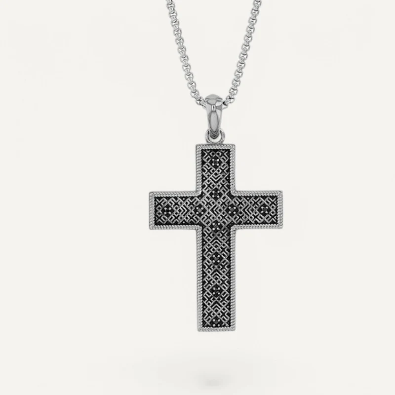 Son pendentif croix avec des détails géométriques noirs apporte une touche de sophistication et de caractère. Ce bijou est idéal pour les hommes qui cherchent à allier foi et style dans leur quotidien.