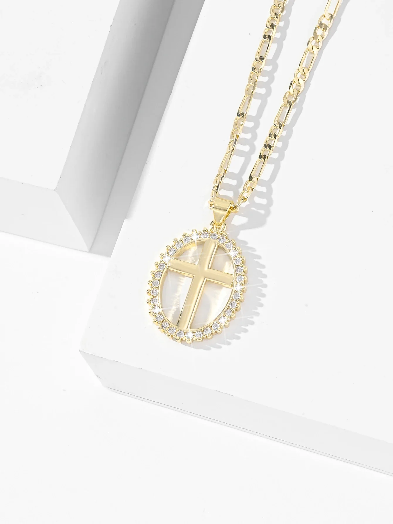 La croix centrale, épurée et brillante, est mise en valeur par une chaîne dorée à maillons plats, pour un rendu à la fois raffiné et affirmé.