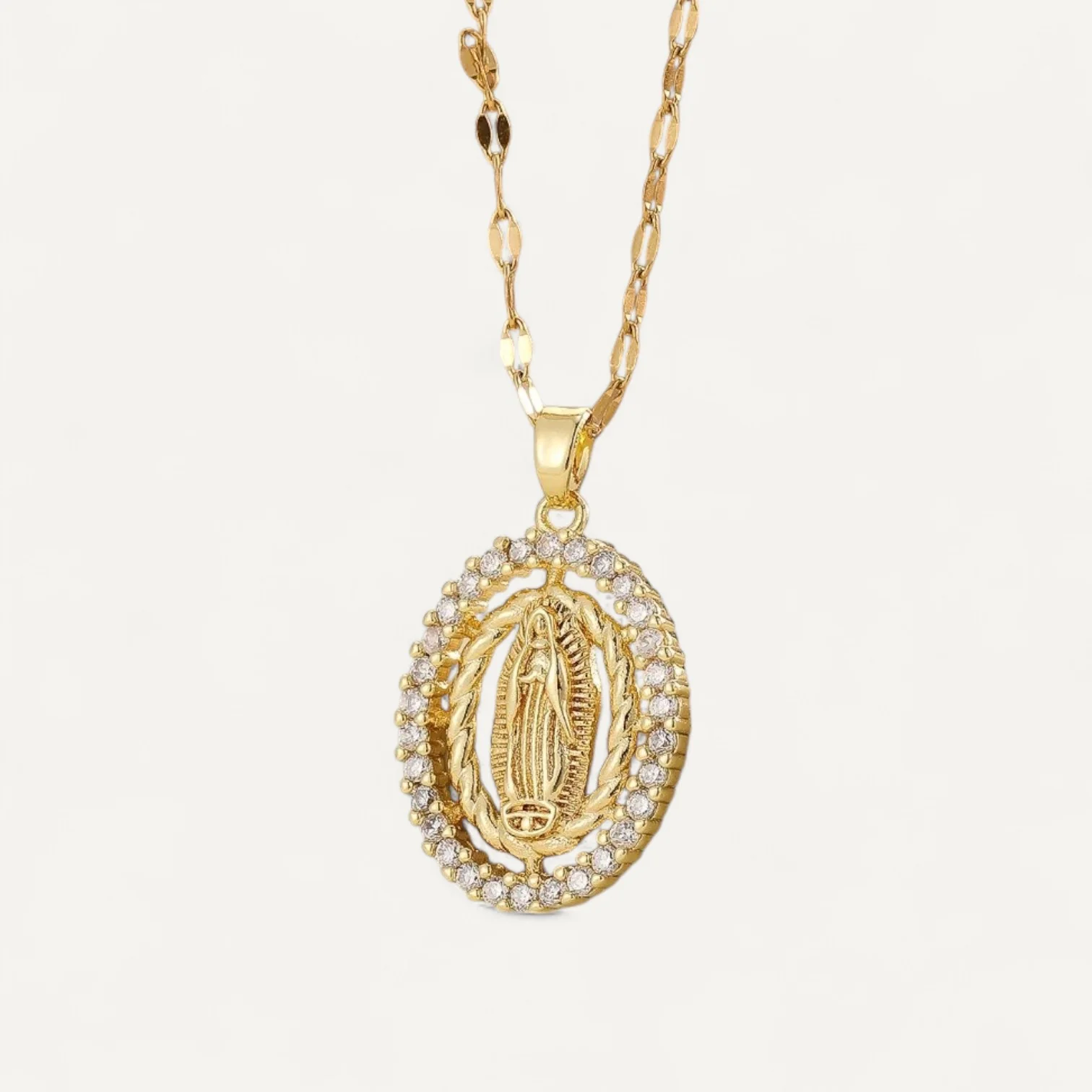 Son pendentif ovale aux détails raffinés est suspendu à une chaîne dorée à maillons ajourés, parfaite pour sublimer votre foi avec discrétion et éclat.