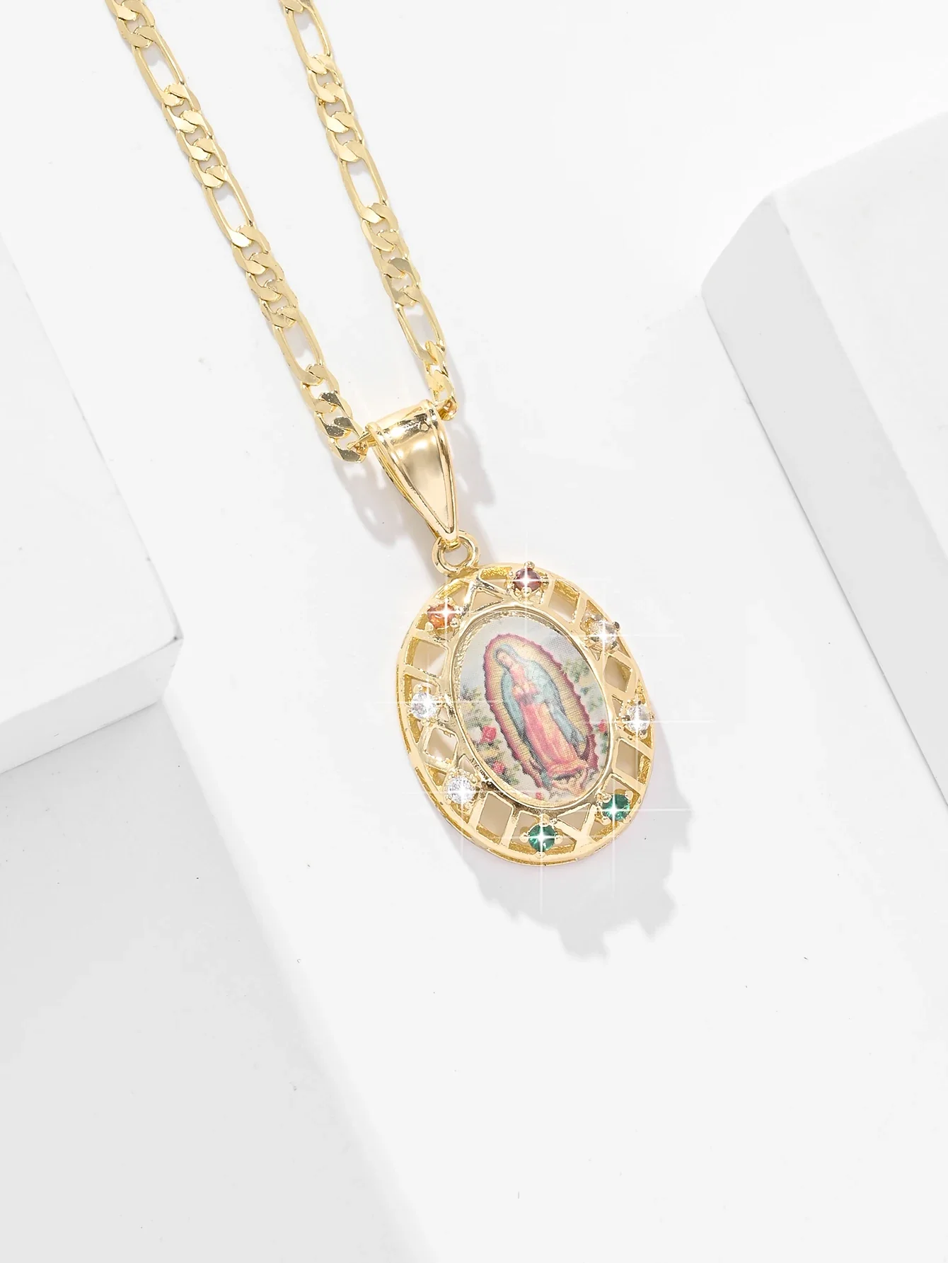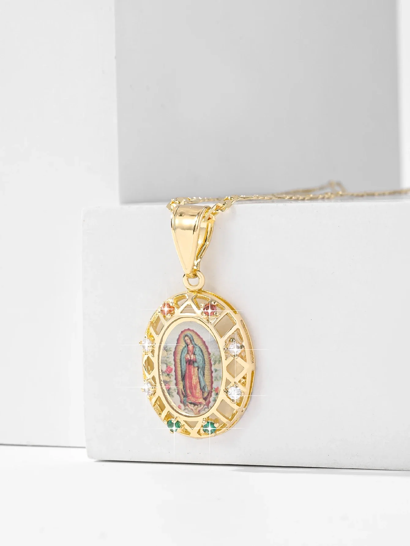 Ce collier croix doré, orné d’un médaillon représentant la Vierge Marie en couleurs, est un bijou empreint de foi et de tradition.
