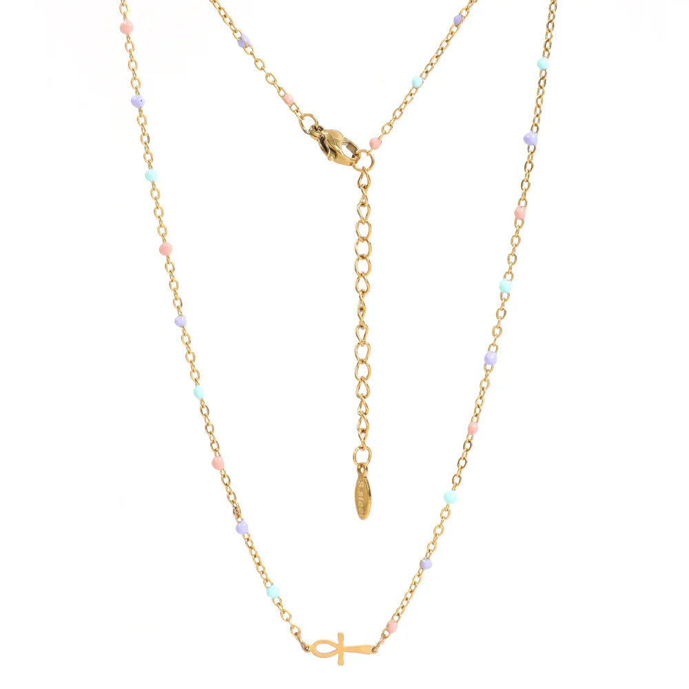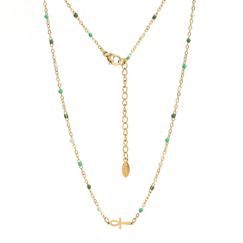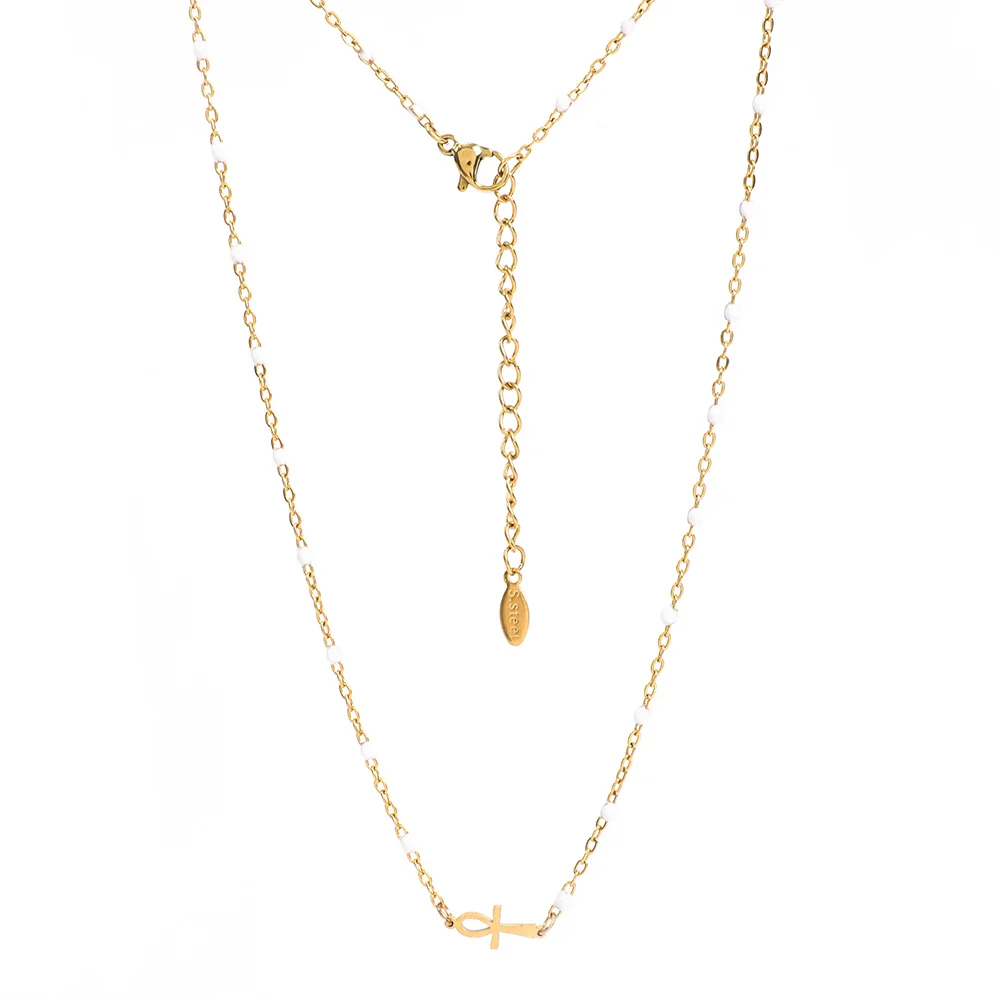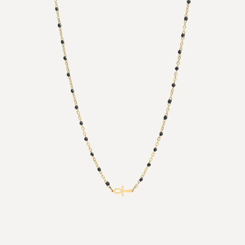 Orné d’un pendentif en forme de croix égyptienne, ce bijou est un hommage aux symboles puissants de cette civilisation fascinante. La chaîne en or délicatement incrustée de petites perles noires ajoute une touche de sophistication et de mystère, faisant de ce collier un accessoire parfait pour toutes les occasions.