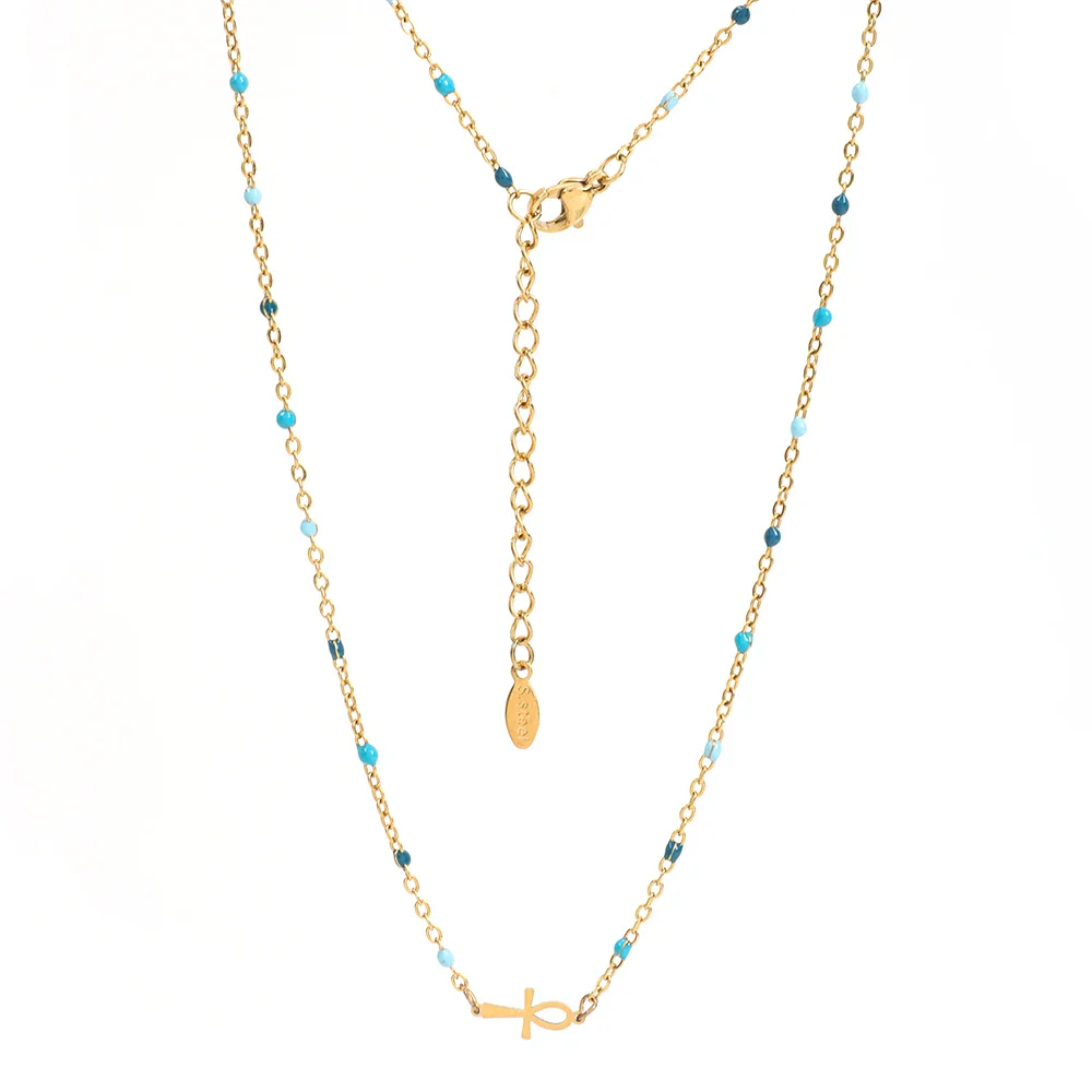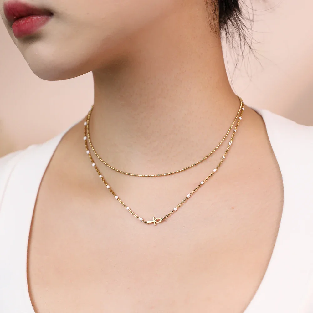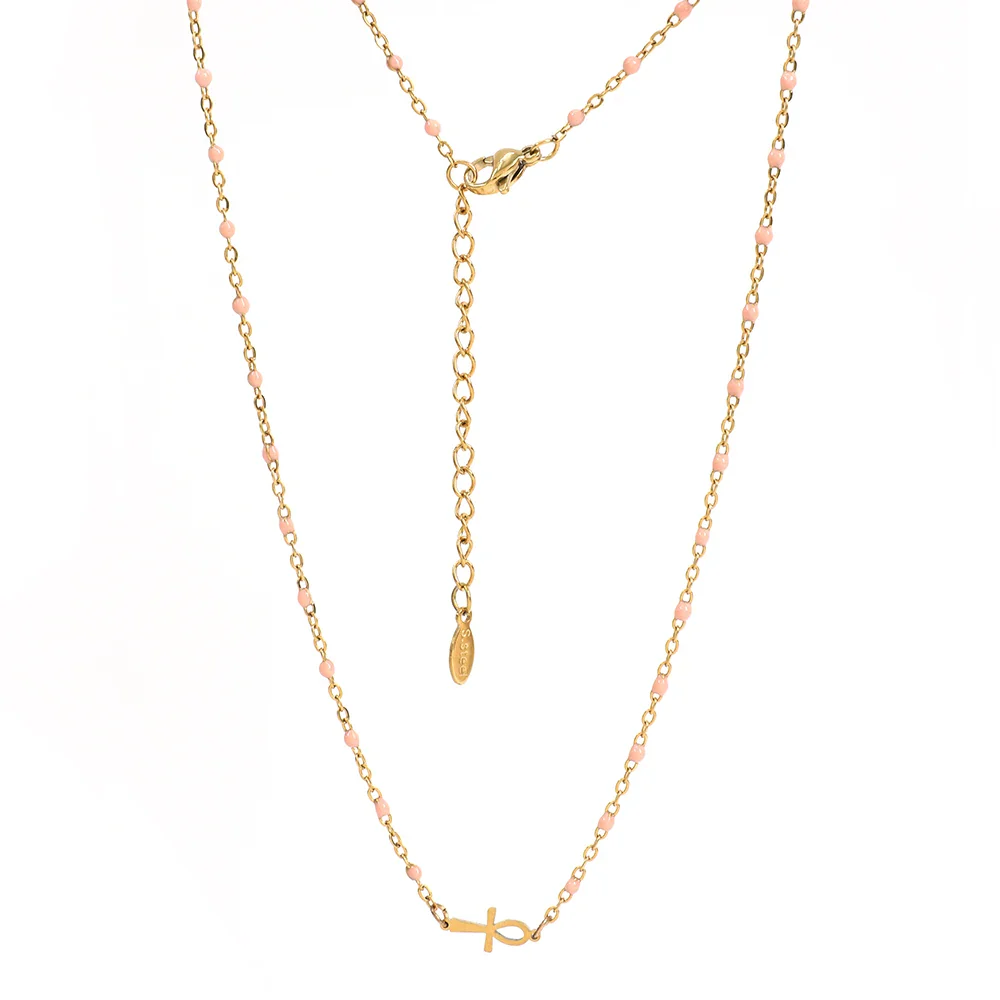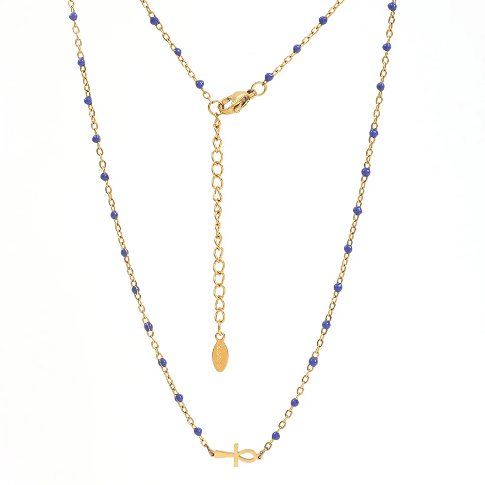 Orné d’un pendentif en forme de croix égyptienne, ce bijou est un hommage aux symboles puissants de cette civilisation fascinante. La chaîne en or délicatement incrustée de petites perles noires ajoute une touche de sophistication et de mystère, faisant de ce collier un accessoire parfait pour toutes les occasions.