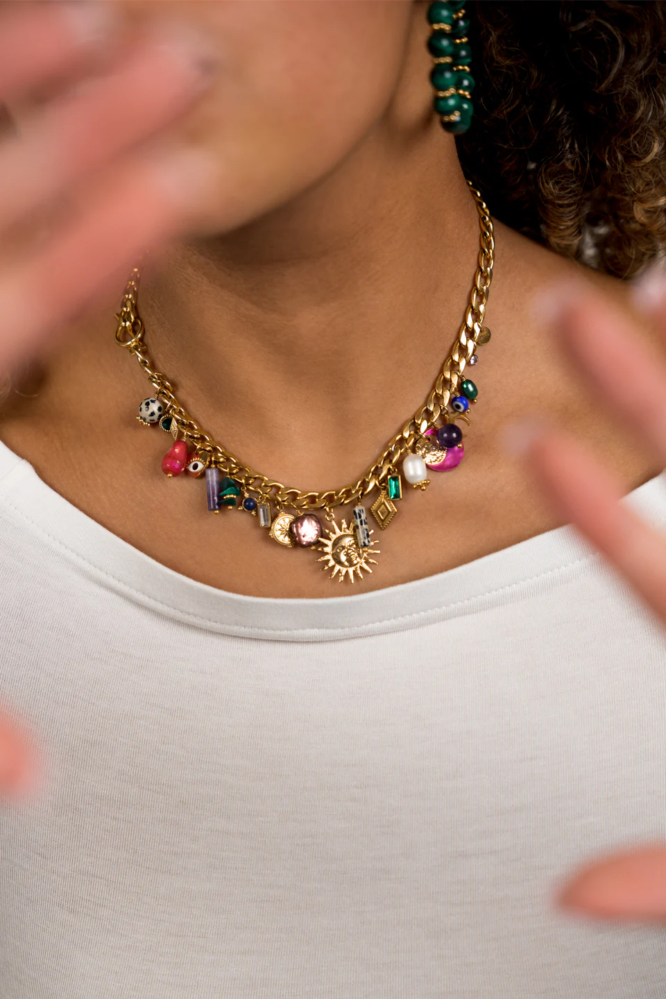 Le collier Horia est fabriqué à la main dans mon atelier, Il est composé d’une chaine gourmette, décorée d’un fermoir bâton et d’une multitude de pampilles dorées et en pierre semi-précieuses,