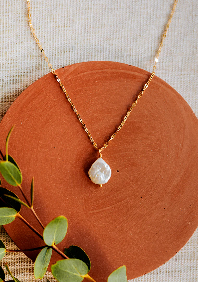Le collier Iris est fabriqué à la main dans mon atelier, Il est monté sur une fine chaine aux maillons ovales et orné d’un pendentif en Perle d’eau douce brute aux multiples reflets,