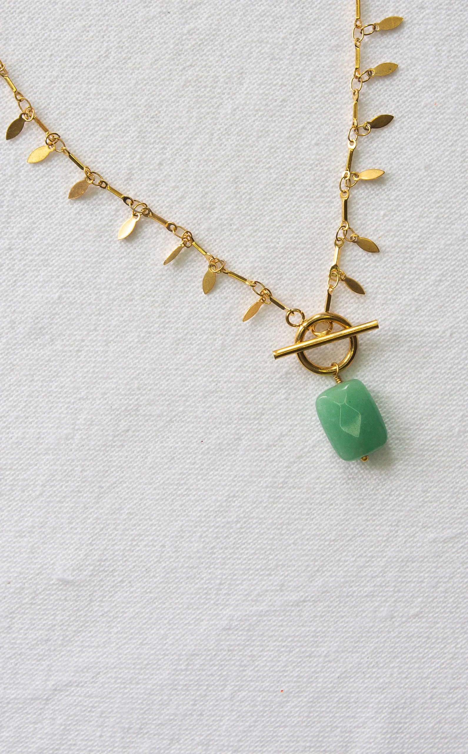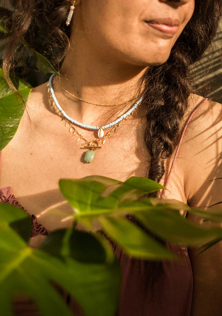 Le collier Lou est fabriqué à la main dans mon atelier, Il est monté sur une chaine décorée de petites médailles en forme de goutte, d’un fermoir bâton et d’un pendentif en Aventurine,