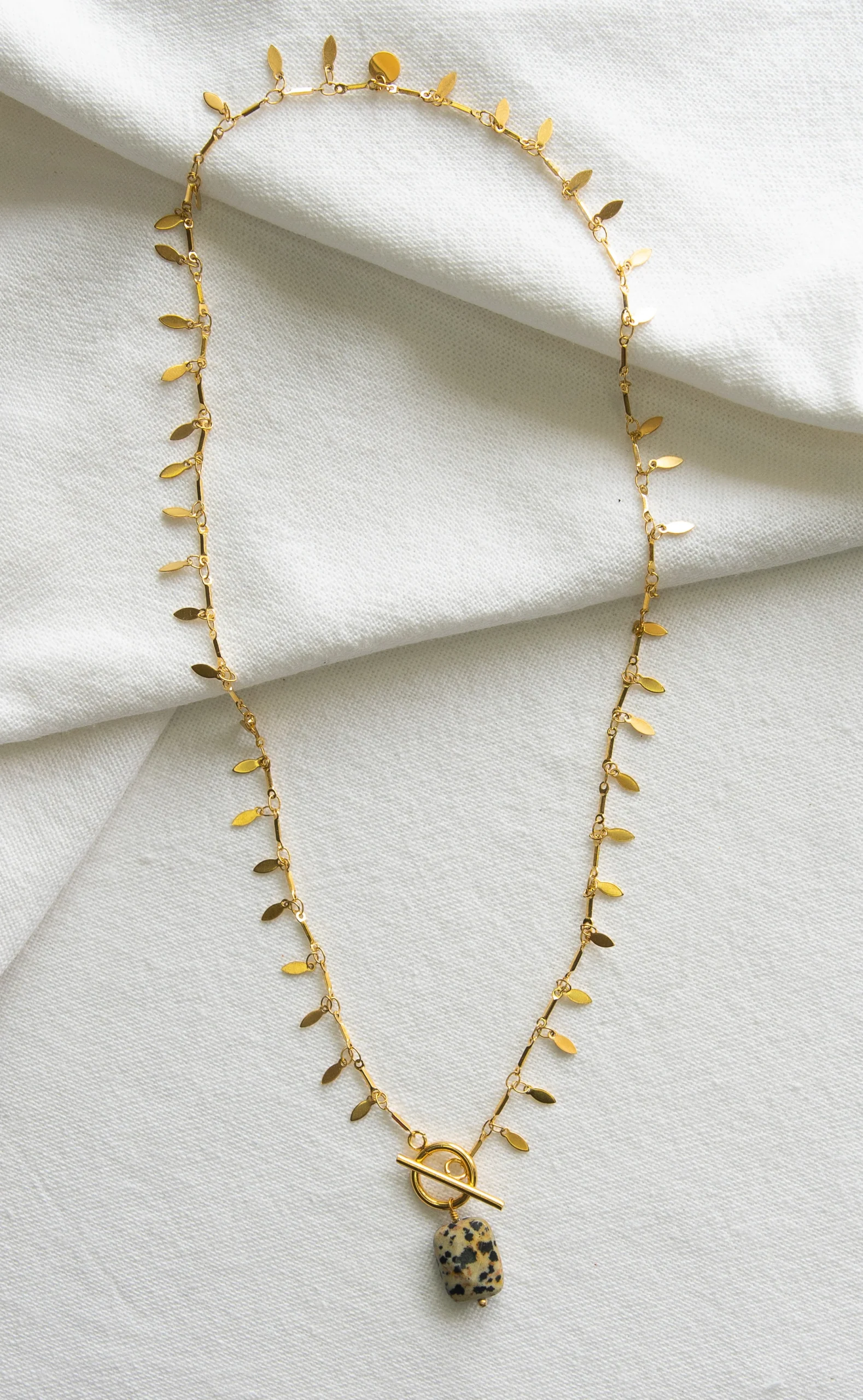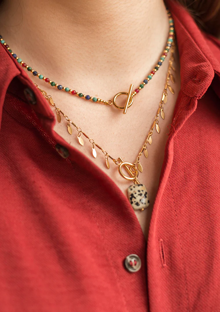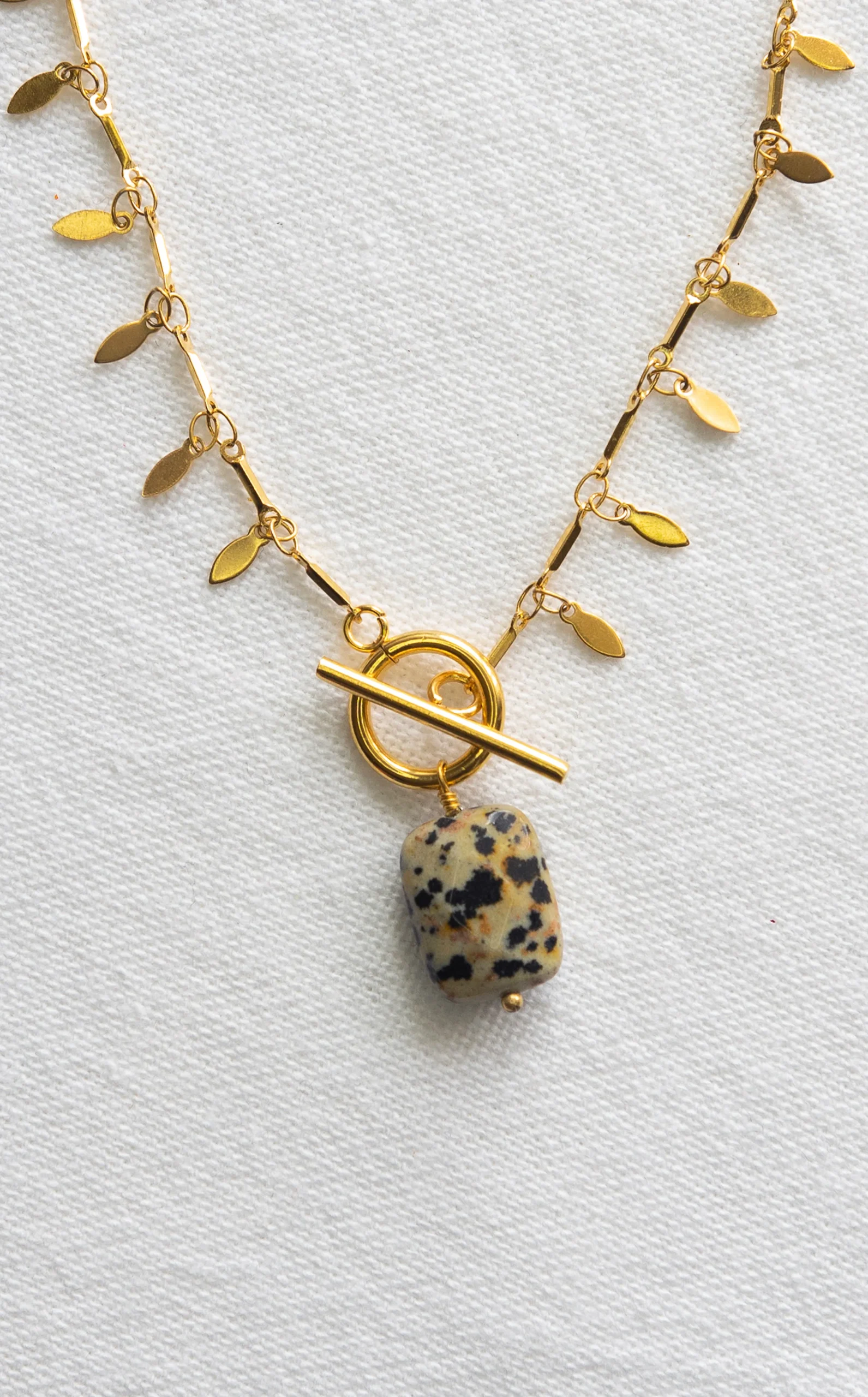 Le collier Lou est fabriqué à la main dans mon atelier, Il est monté sur une chaine décorée de petites médailles en forme de goutte, d’un fermoir bâton et d’un pendentif en Jaspe dalmatien,