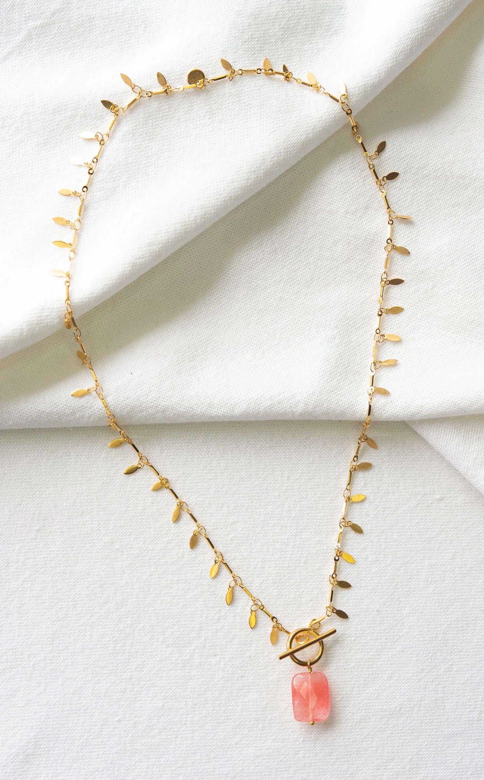 Le collier Lou est fabriqué à la main dans mon atelier, Il est monté sur une chaine décorée de petites médailles en forme de goutte, d’un fermoir bâton et d’un pendentif en Quartz cerise