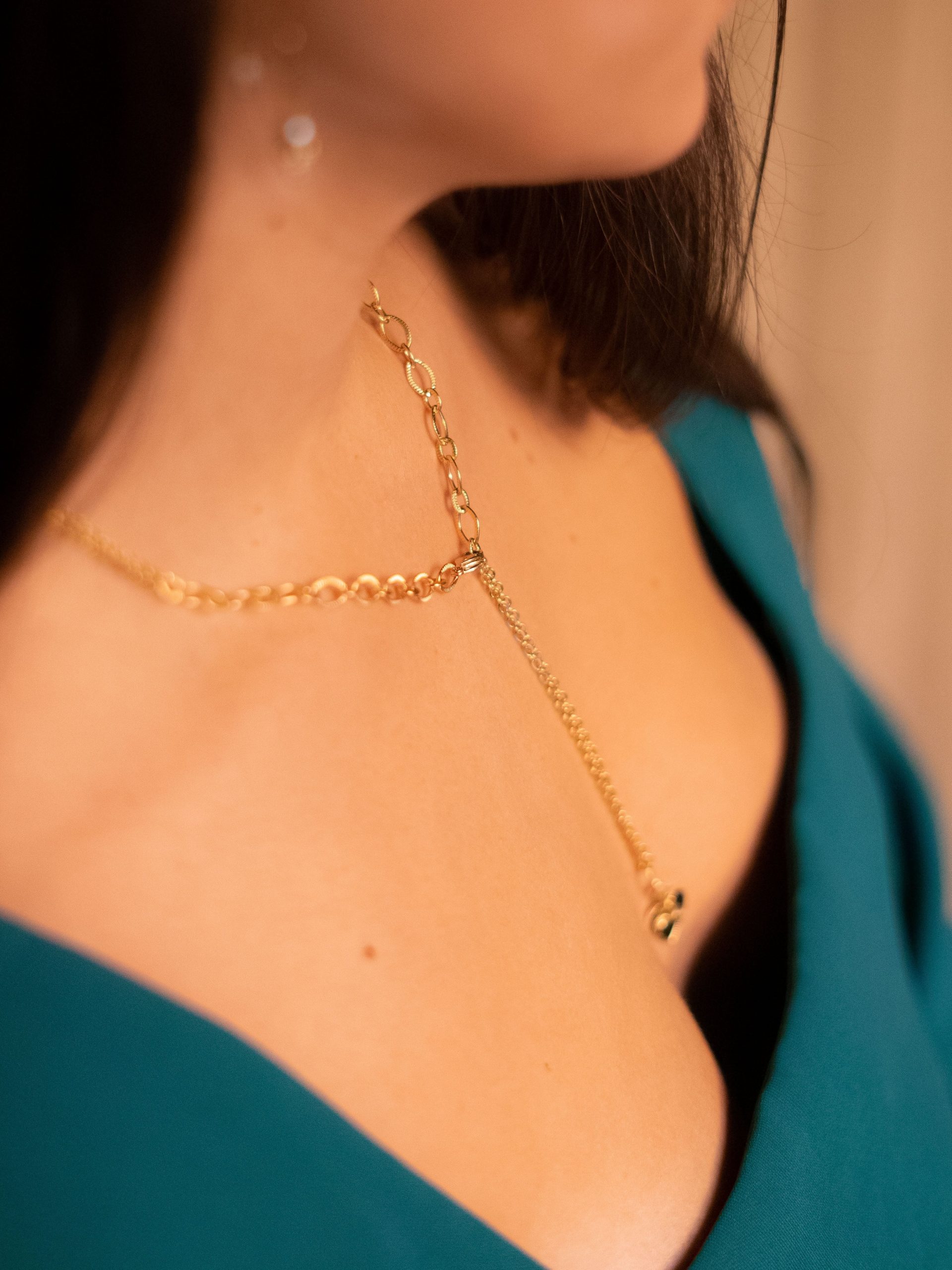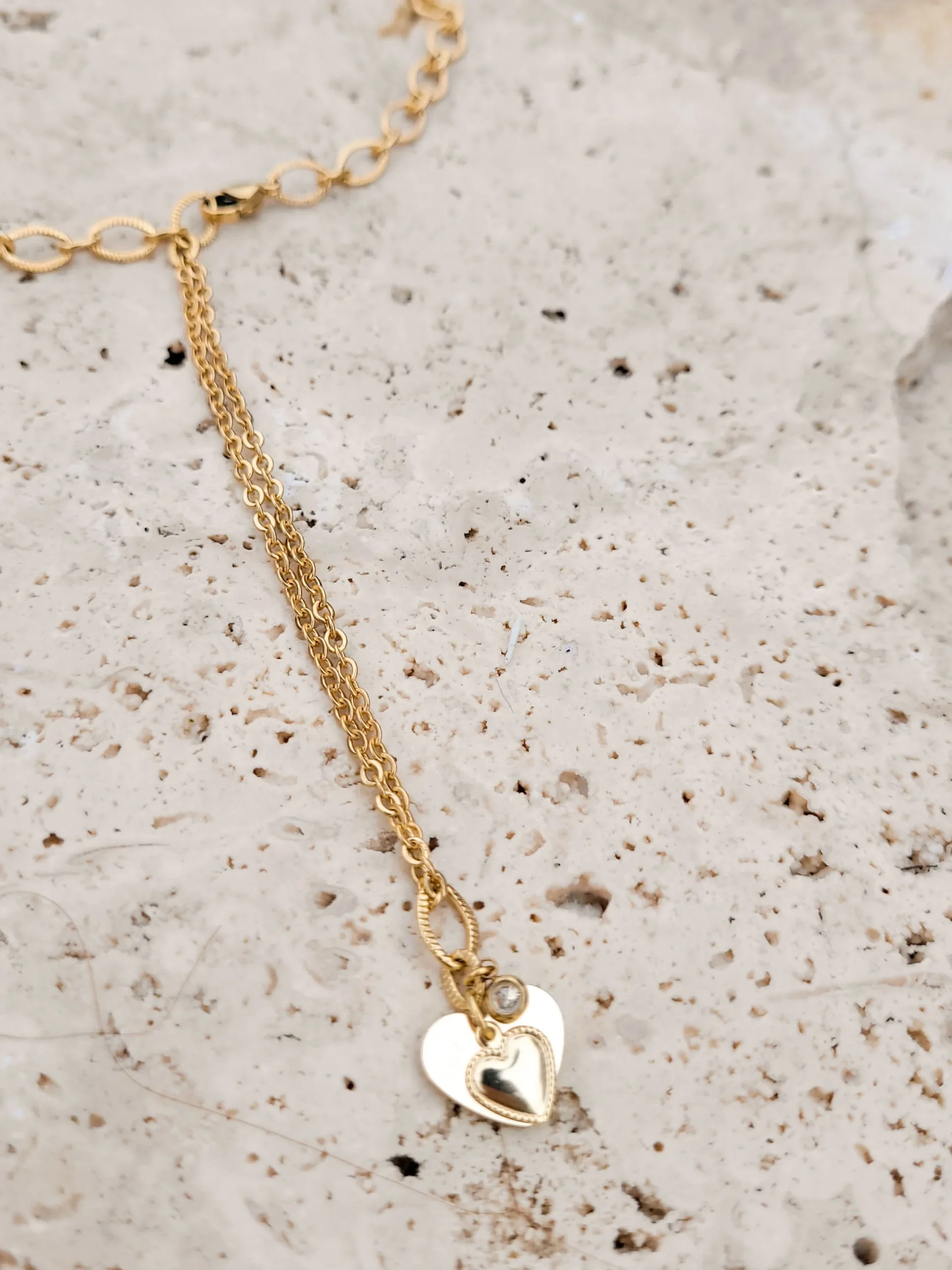 Le collier Naya est fabriqué à la main dans mon atelier, Il est composé d’une chaines asymétrique et est orné d’un pendentif composé de deux médailles en forme de coeur et d’un strass,