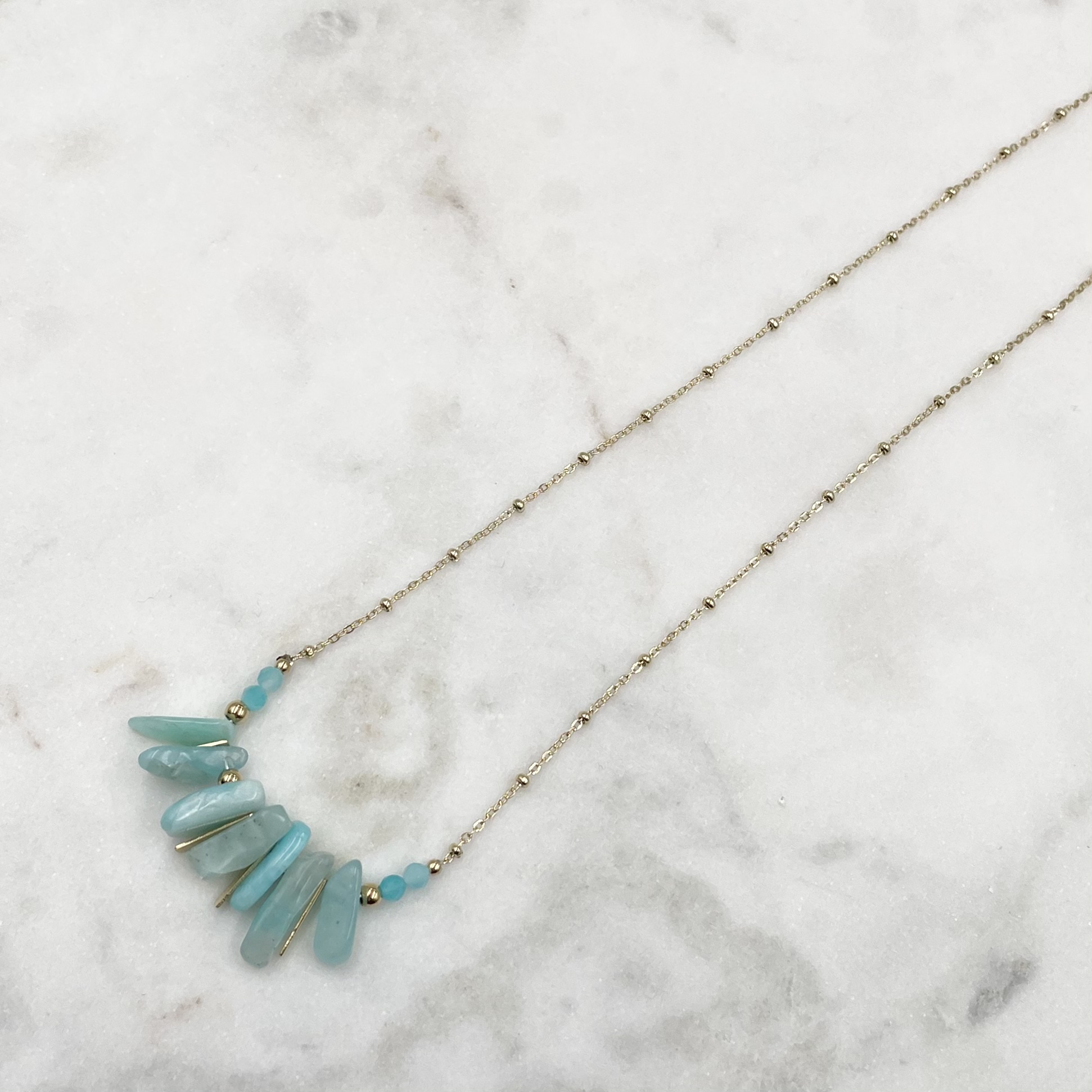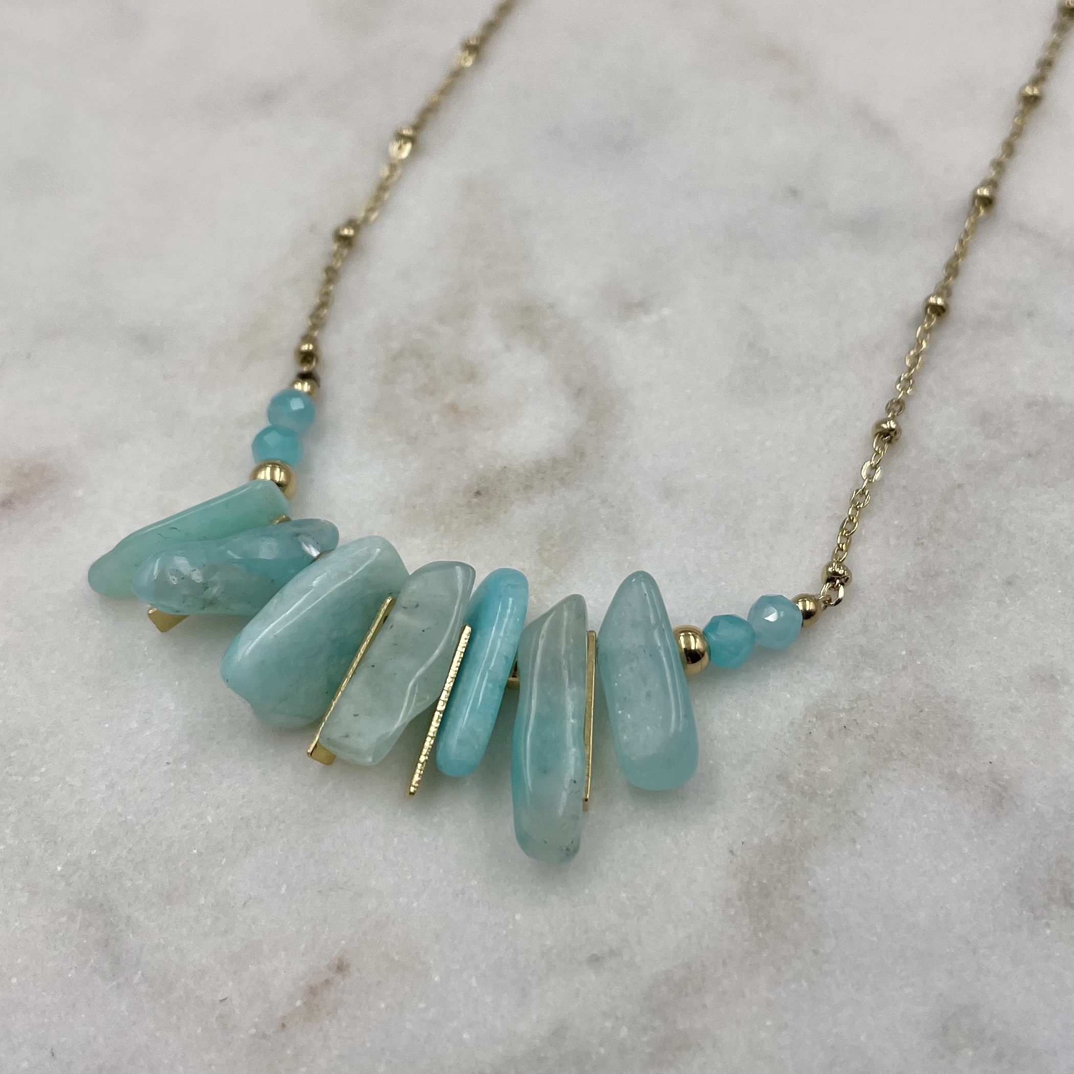 Ce bijou est fabriqué en acier inoxydable doré & pierres naturelles de couleur turquoise : il résiste à l’eau et est anti allergène et sans nickel.
