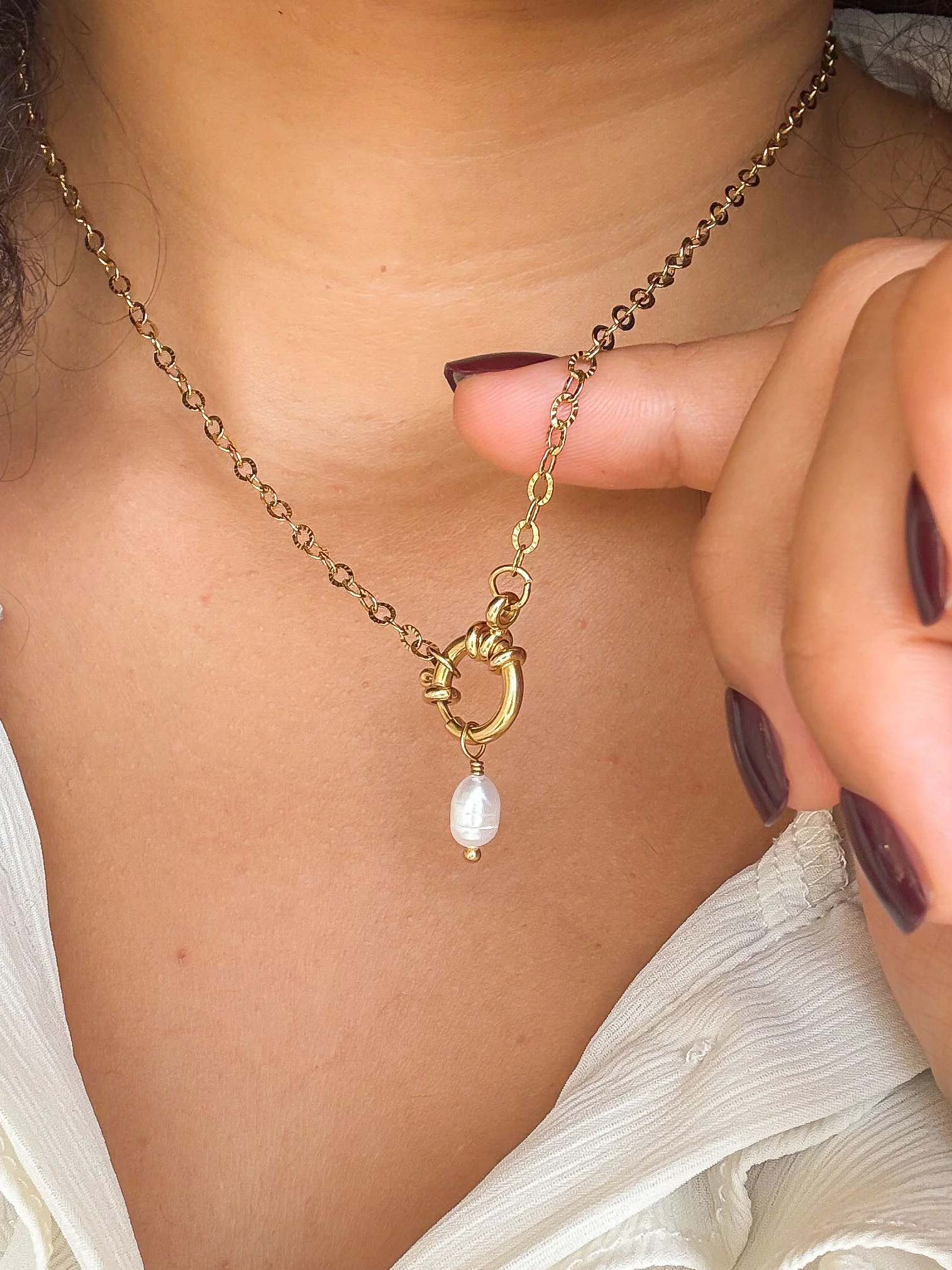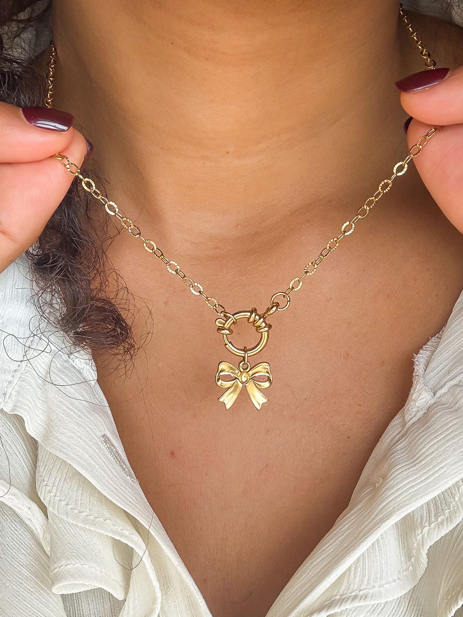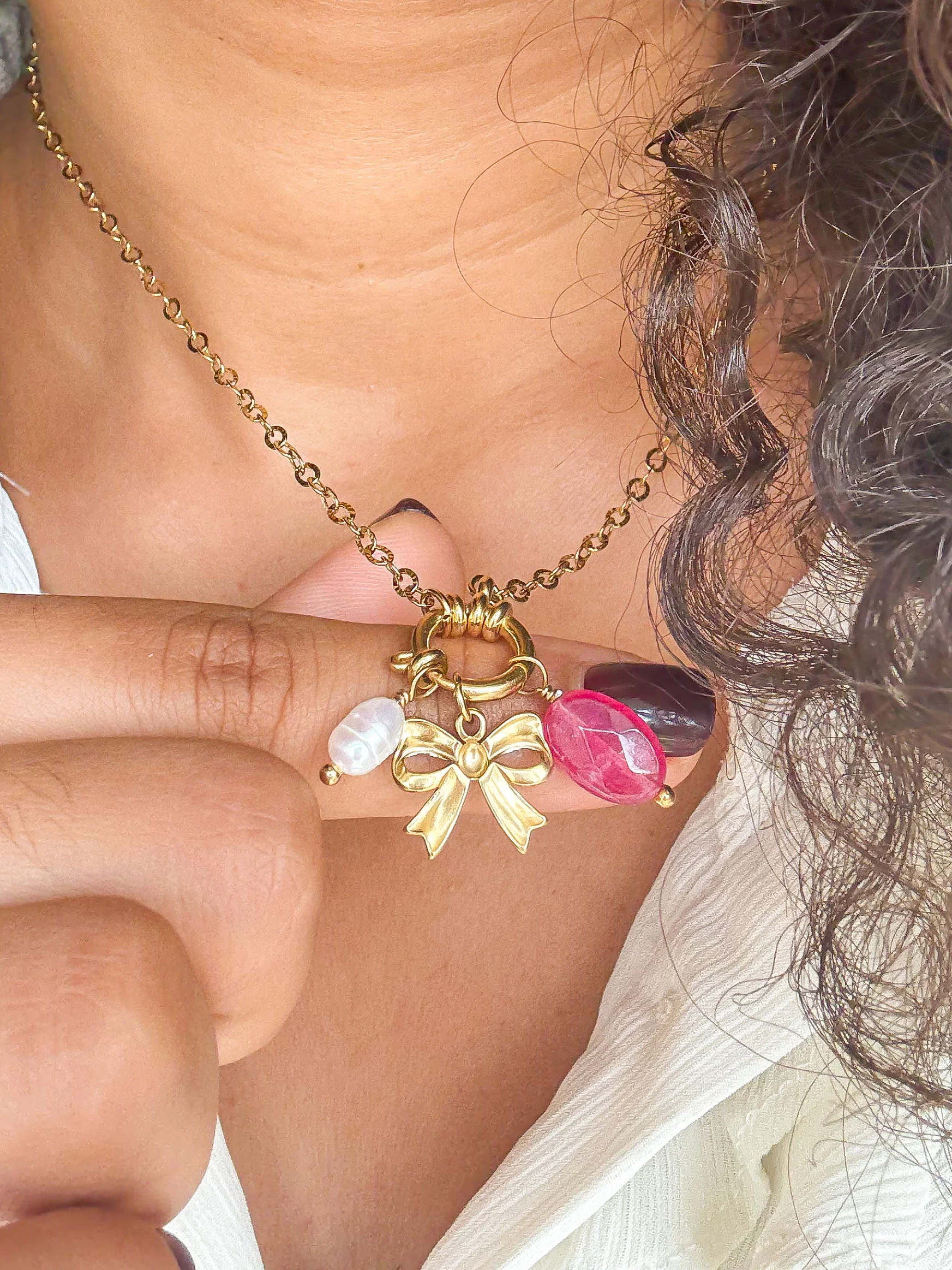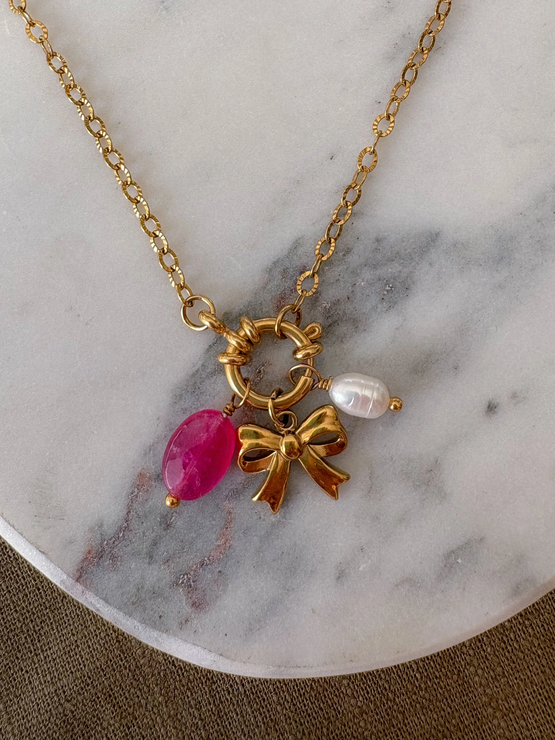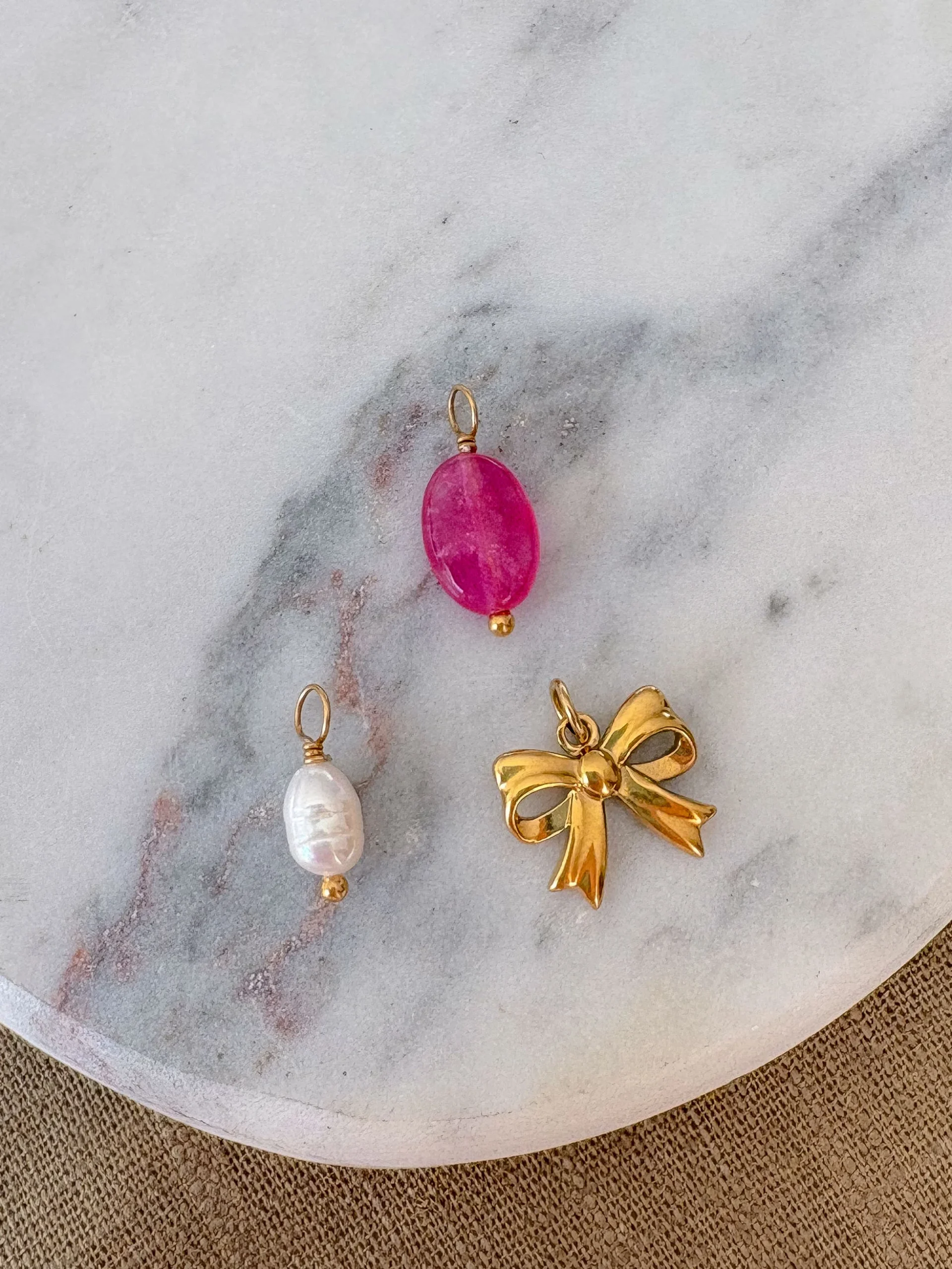 Livré avec 3 charms (Noeud, Jade teintée rose, Perle d’eau douce)