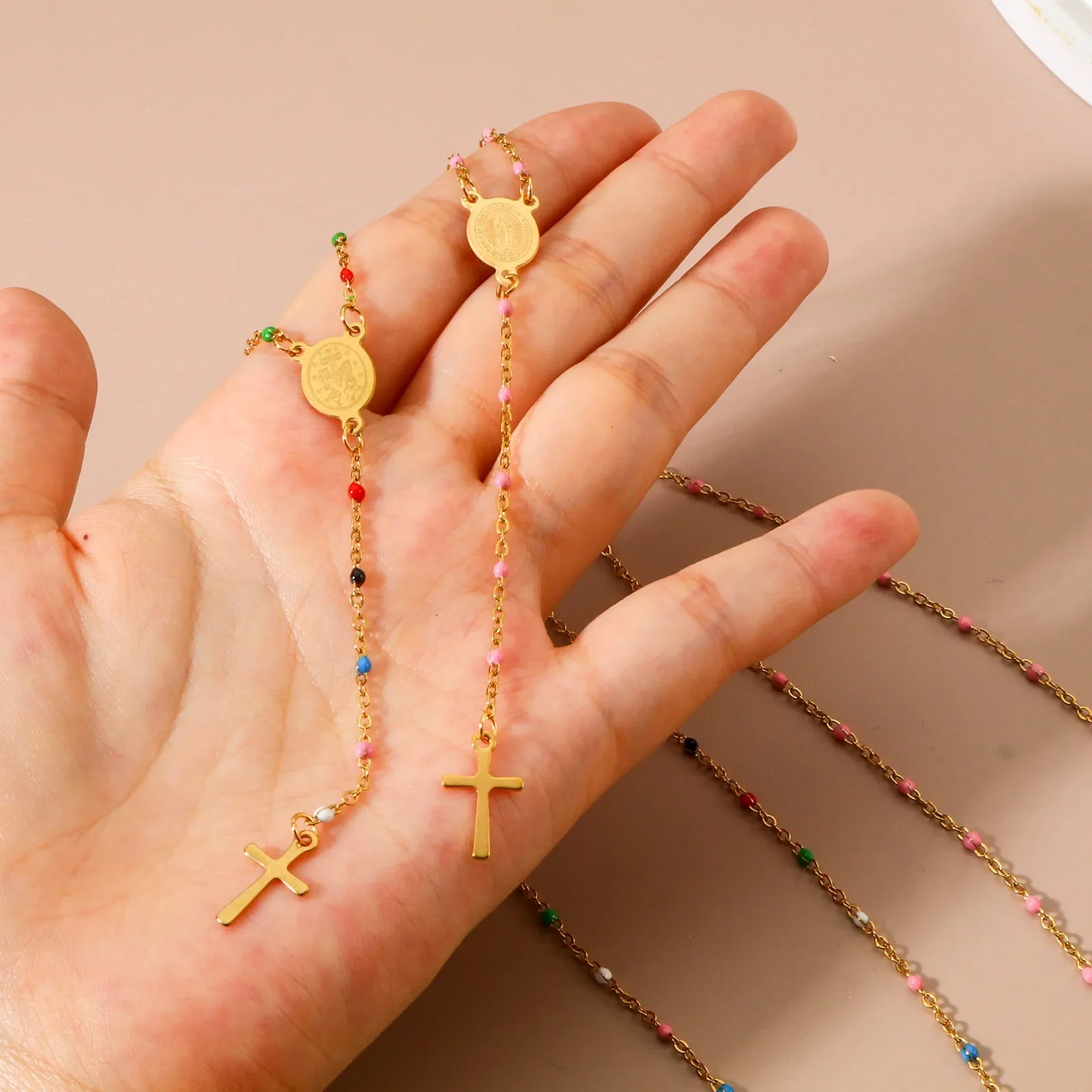 Adoptez un look raffiné tout en exprimant vos convictions spirituelles avec ce collier unique. Chaque perle colorée ajoute une touche de vivacité et d’élégance, faisant de ce bijou un accessoire polyvalent pour toutes les occasions. Le pendentif en forme de croix dorée symbolise la foi et la spiritualité, tandis que le médaillon de la Vierge Marie offre une protection et une bénédiction divine.