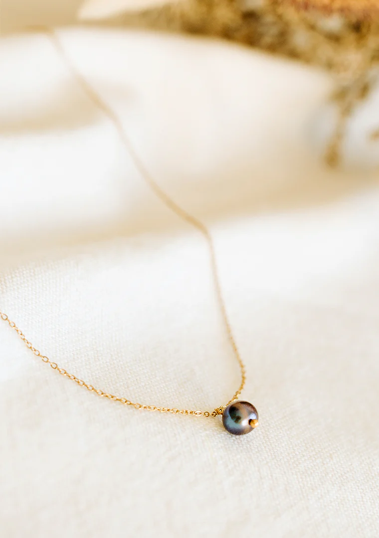 Le collier Tina est fabriqué à la main dans mon atelier, Il est monté sur une fine chaine ornée d’un pendentif en perle d’eau douce grise,