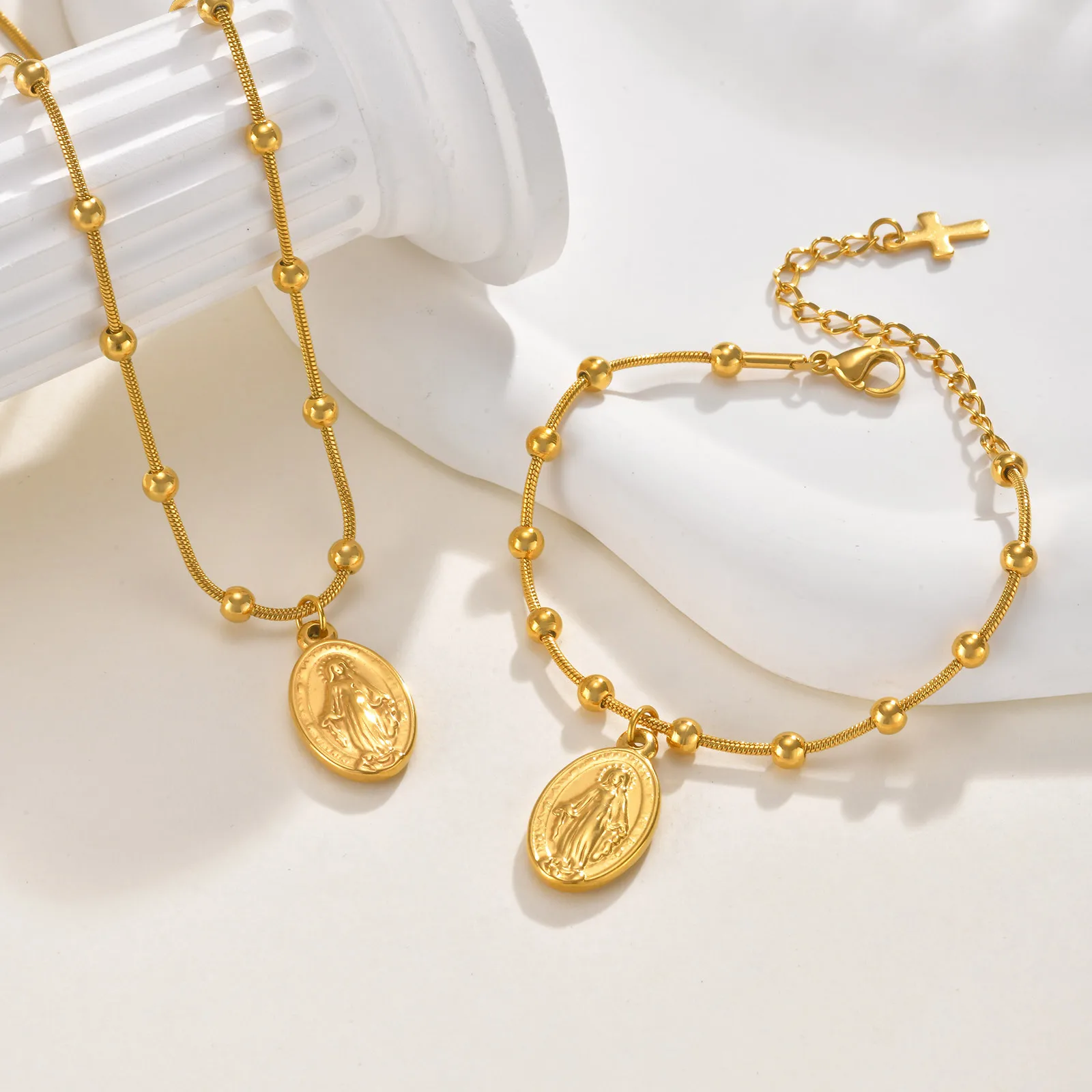 Orné d’une médaille ovale représentant la Sainte Vierge et de perles métalliques régulières, il se décline en deux finitions : dorée lumineuse ou argentée éclatante. Son design discret en fait un bijou spirituel raffiné, parfait pour un usage quotidien ou en signe de protection.