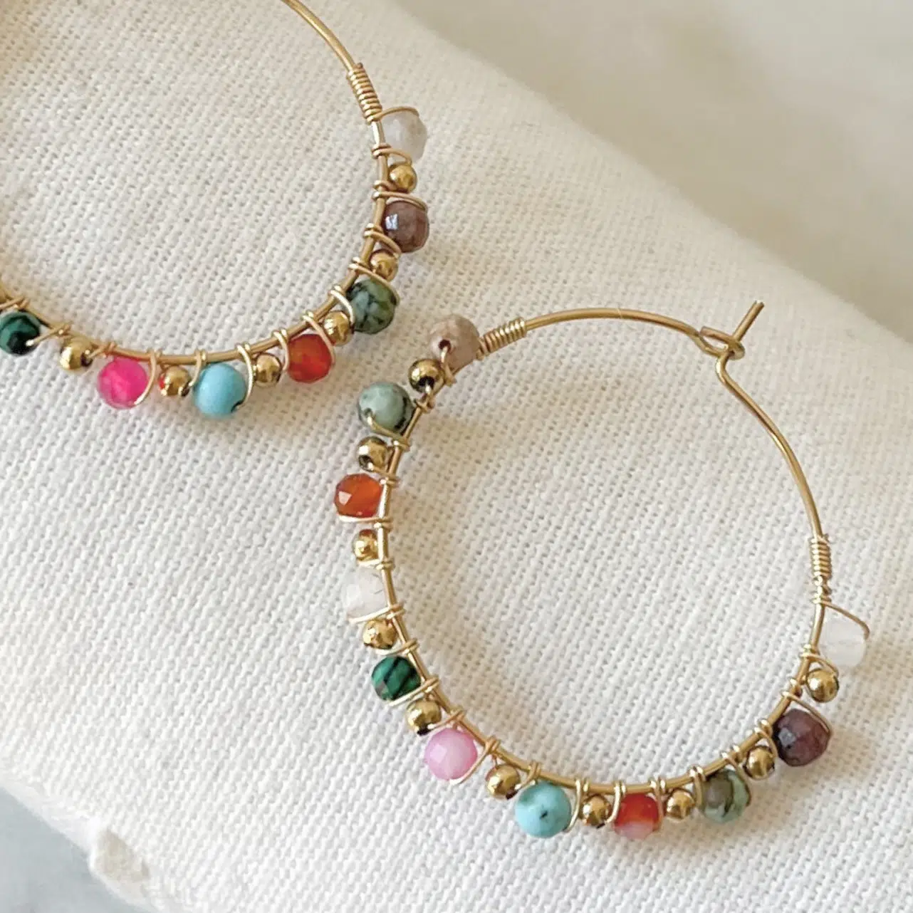 - Créoles de taille moyenne, très travaillées avec un tissage de pierres naturelles et perles de rocailles multicolores