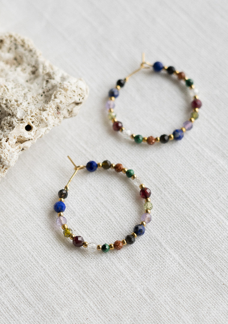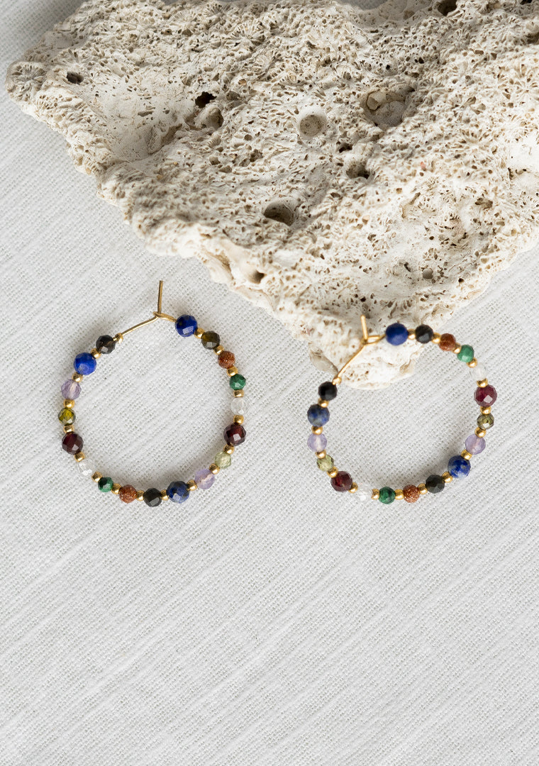Les créoles Nina sont fabriquées à la main dans mon atelier, Elles sont composées d’une multitude de pierres semi-précieuses et de perles dorées,