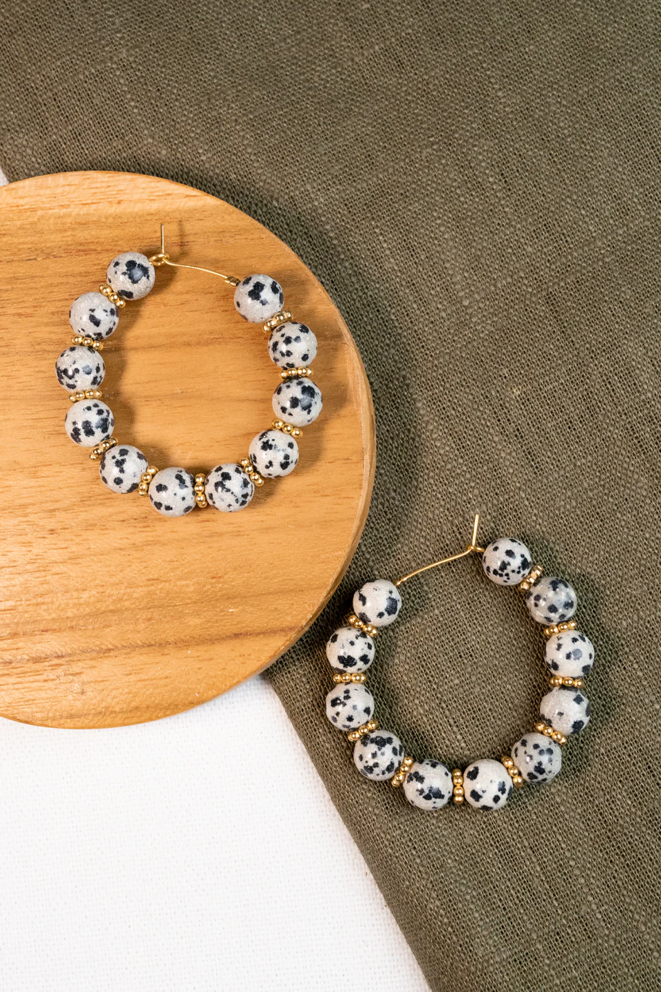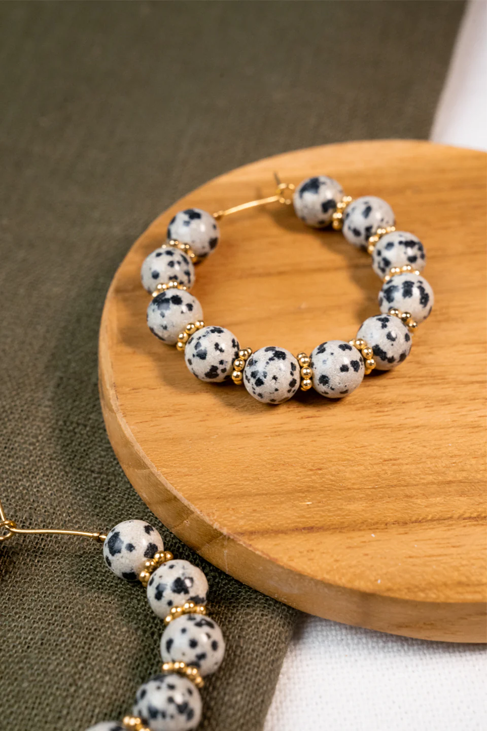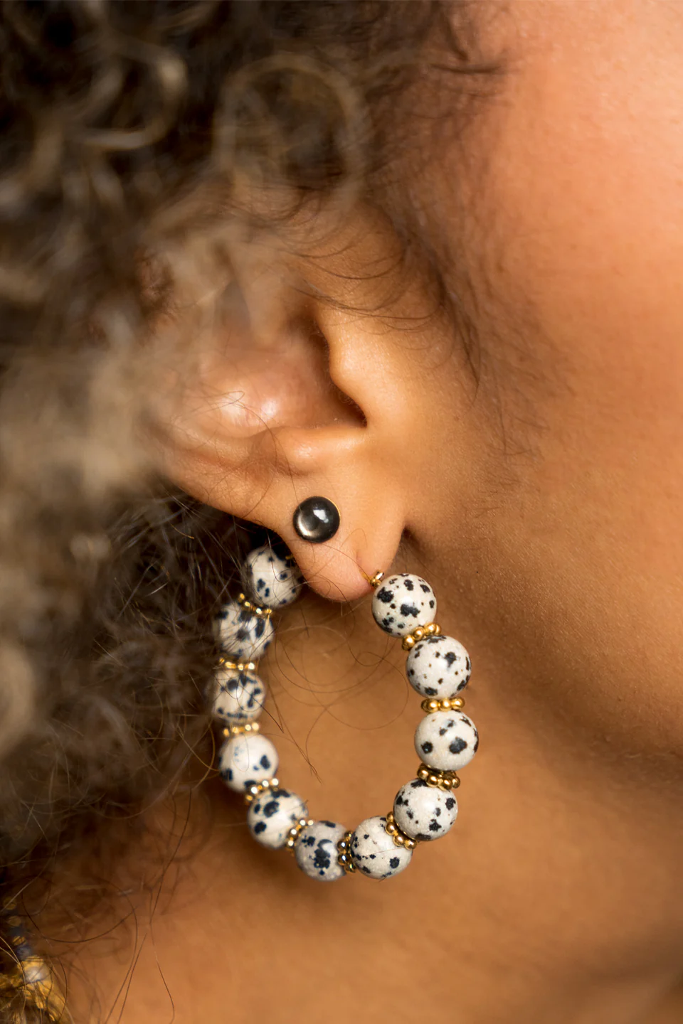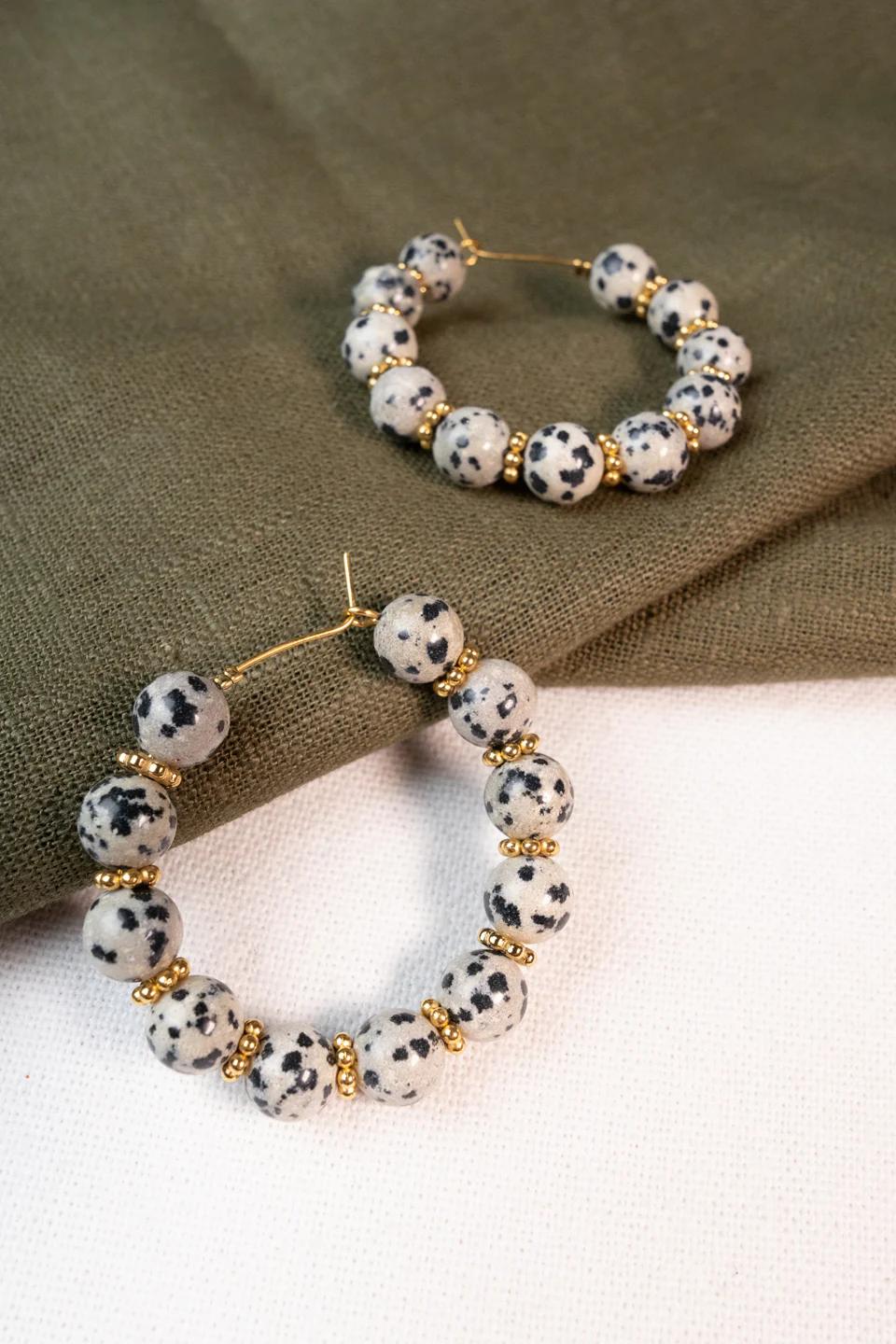 Les créoles Osiris sont fabriqués à la main dans mon atelier, Elles sont composées de perles rondes en Jaspe dalmatien ainsi que de perles dorées,
