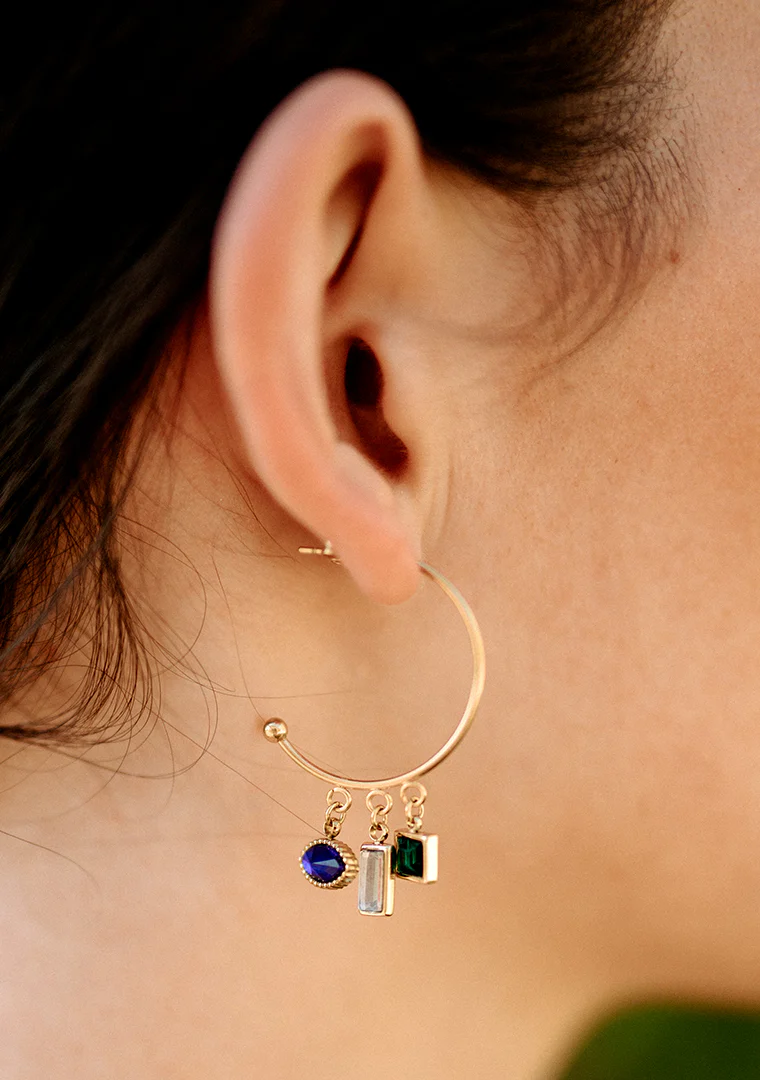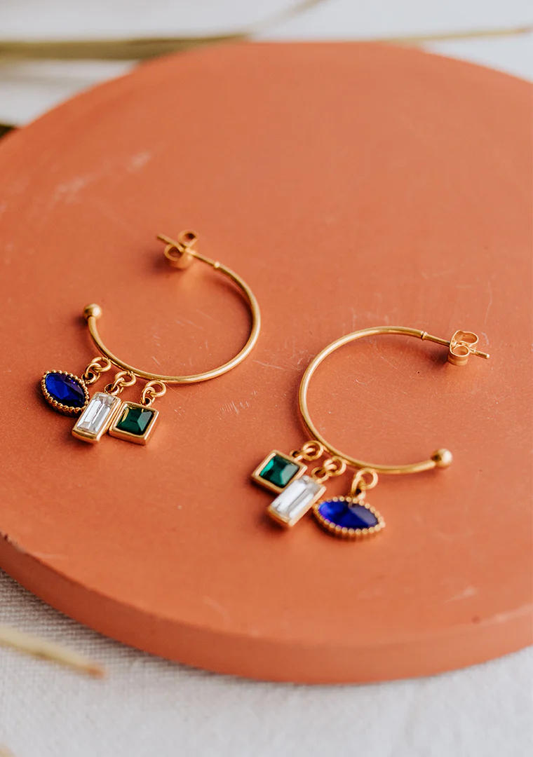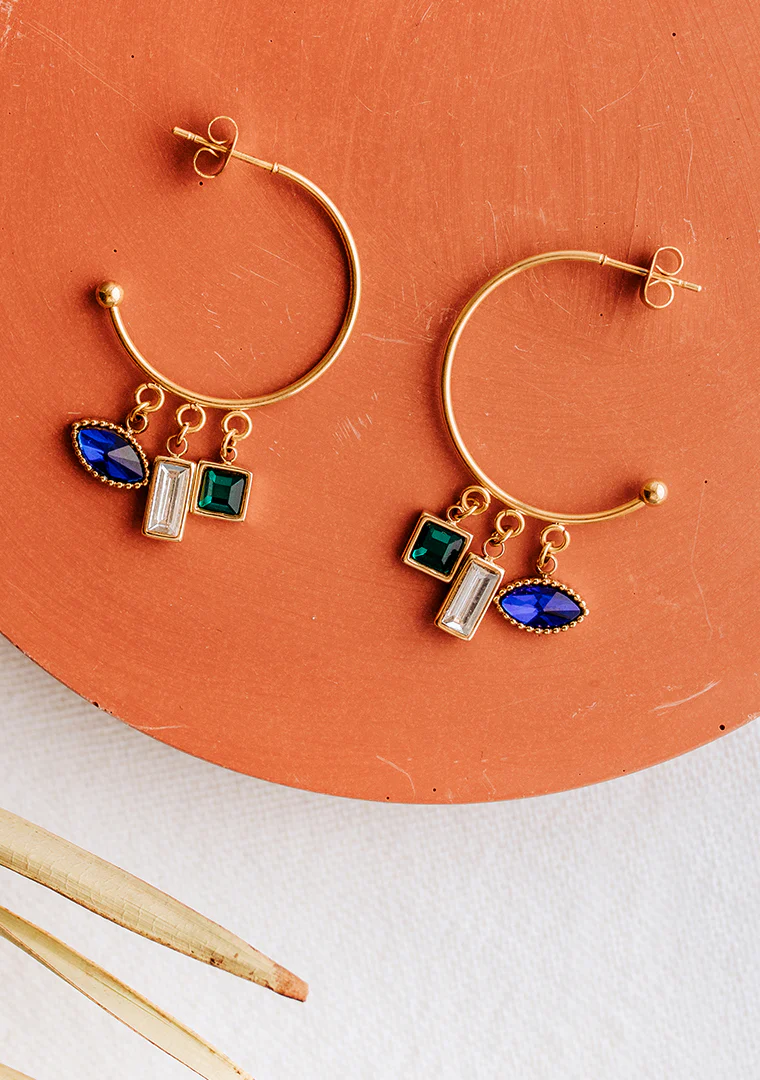 Les créoles Ster sont fabriquées à la main dans mon atelier, Elles sont composées de pampilles décorées de strass vert, bleu et blanc,