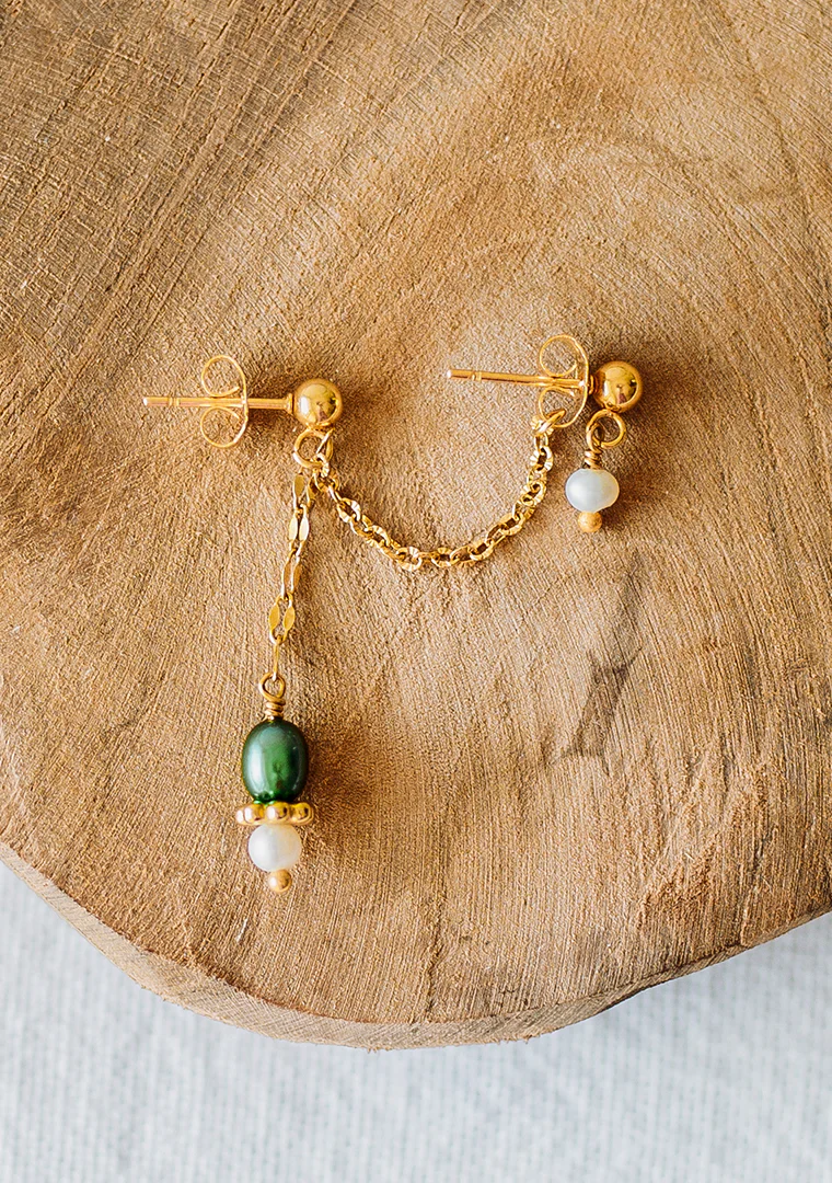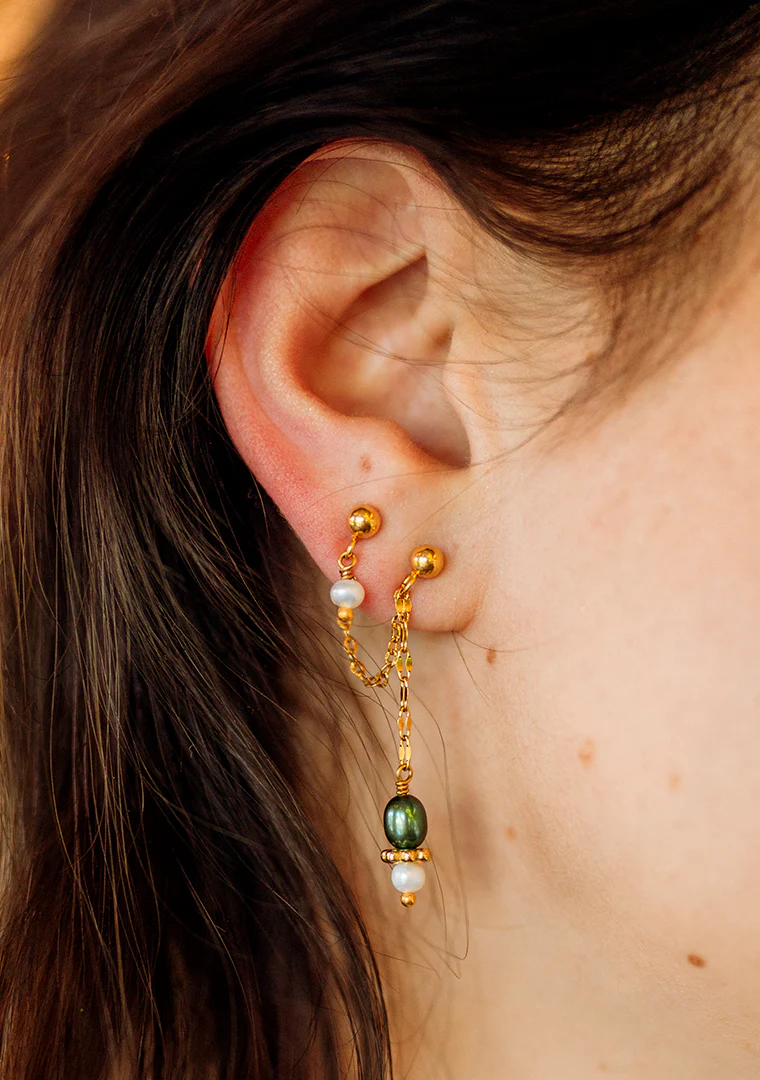 La double boucles d’oreilles Calypso est fabriqué à la main dans mon atelier, Elle est composé d’une double chaines aux maillons ovales striés et lisses, ainsi que de deux pendents décorés de Perles d’eau douce blanches et verte, et d’une perle doré,