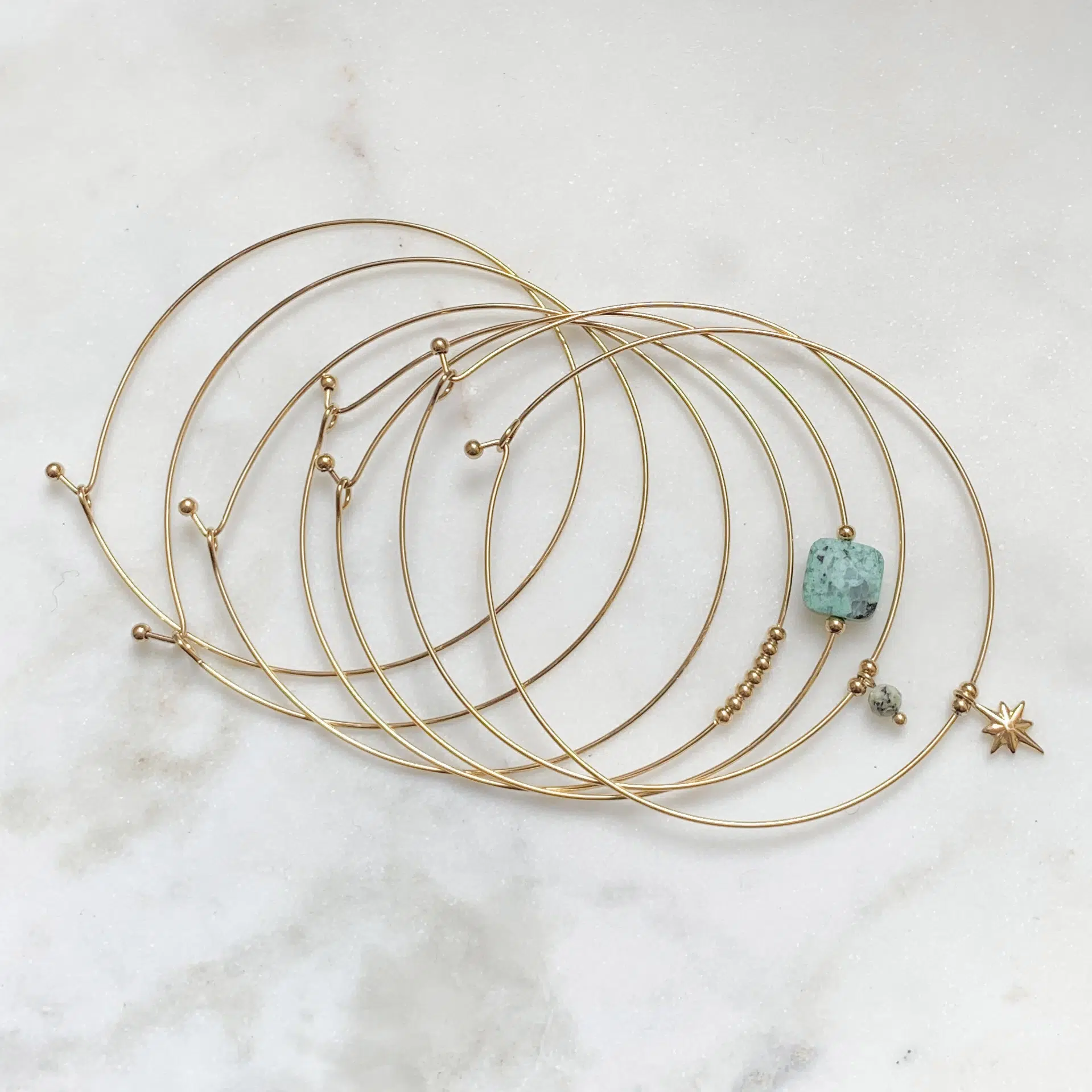Ce bijou est composé de sept joncs très fins, avec petites pampilles en acier inoxydable et pierres naturelles de couleur vert de gris.