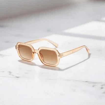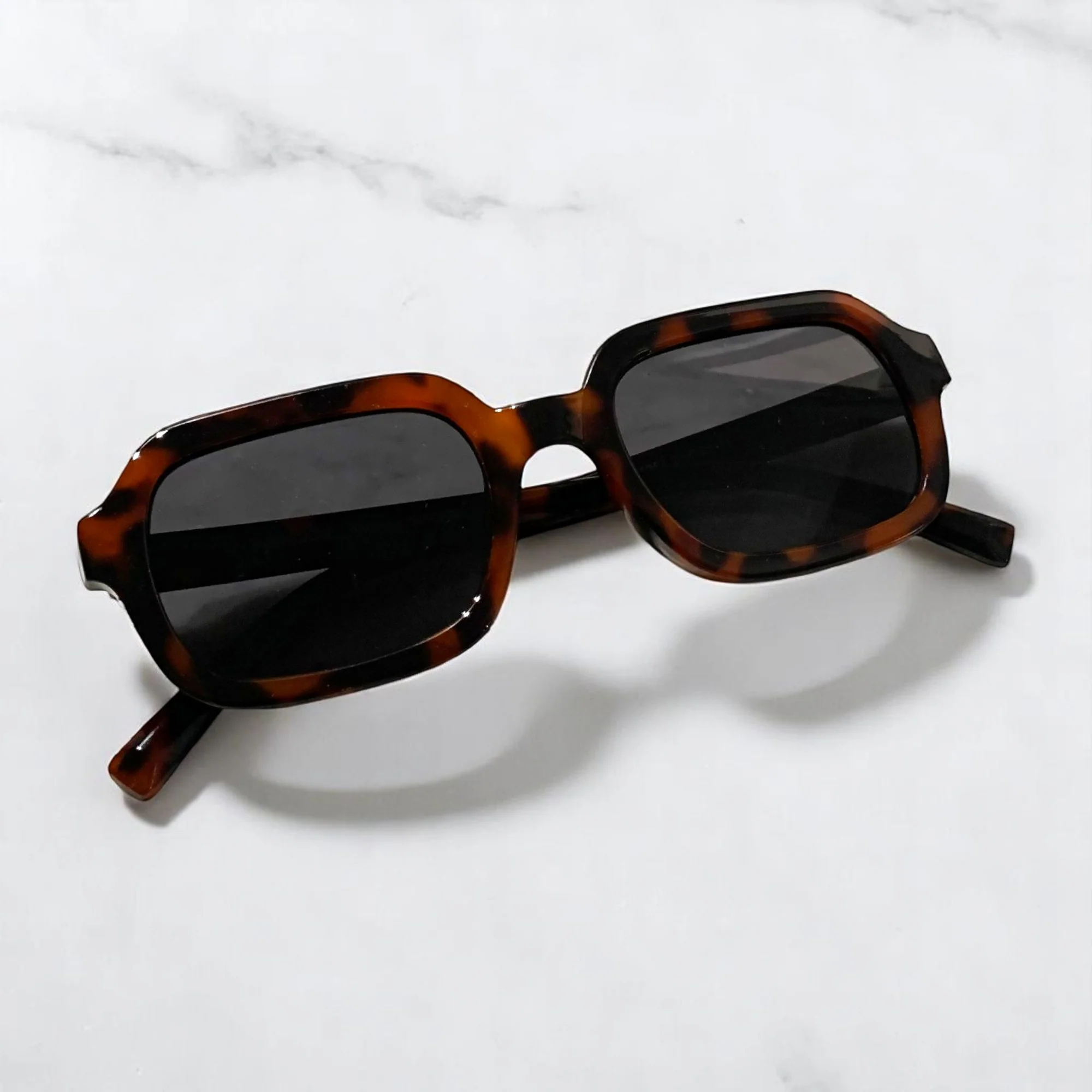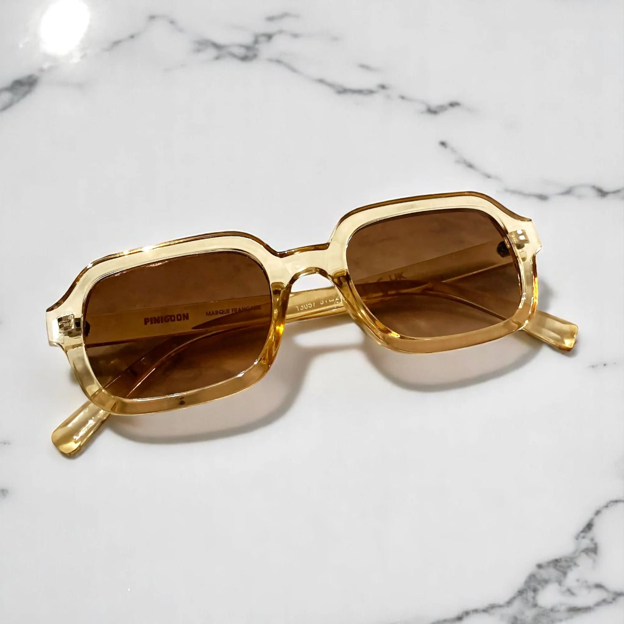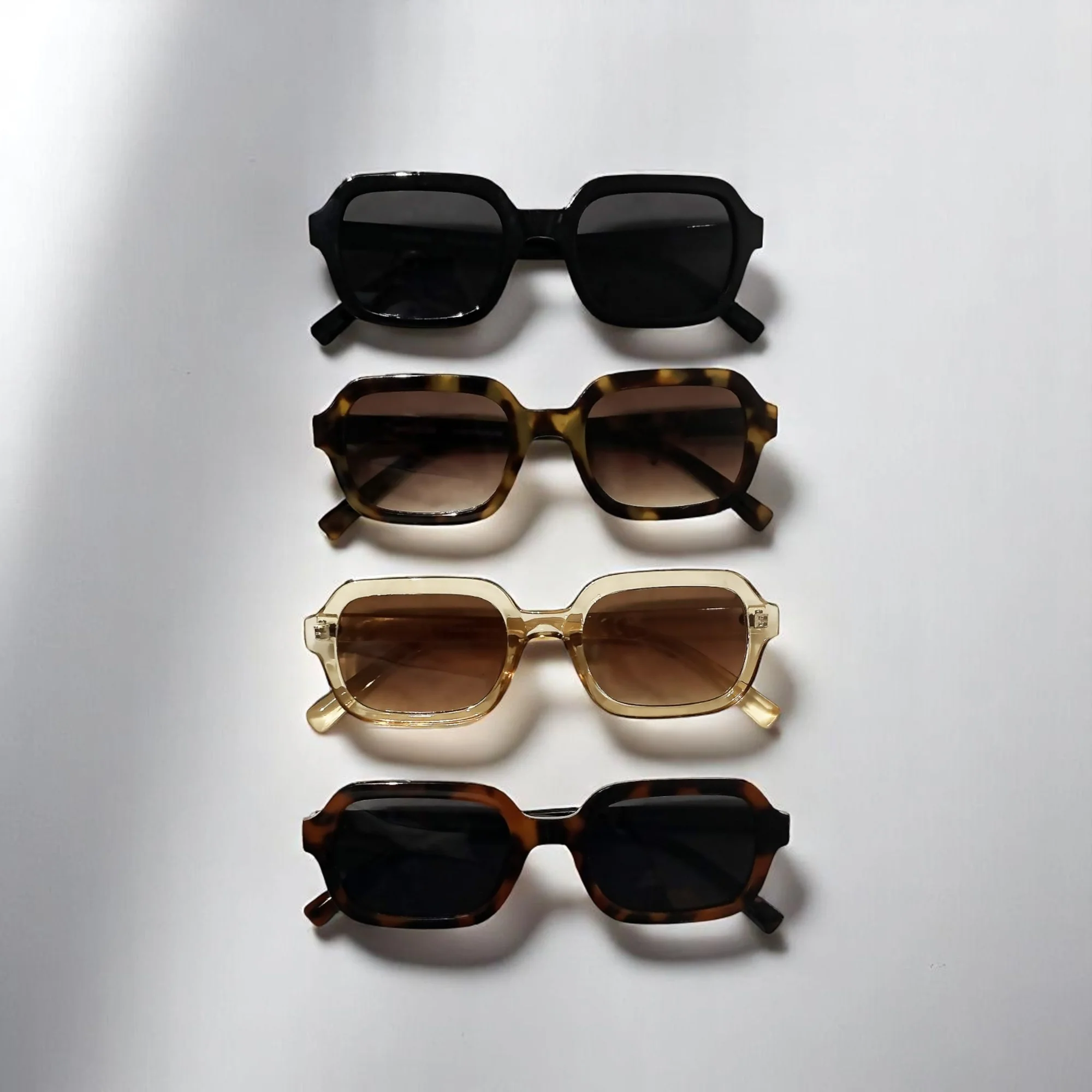 Lunettes de soleil rectangulaires, disponibles en quatre coloris, noir, écaille foncé, écaille claire (verres dégradés) et cristal orange.