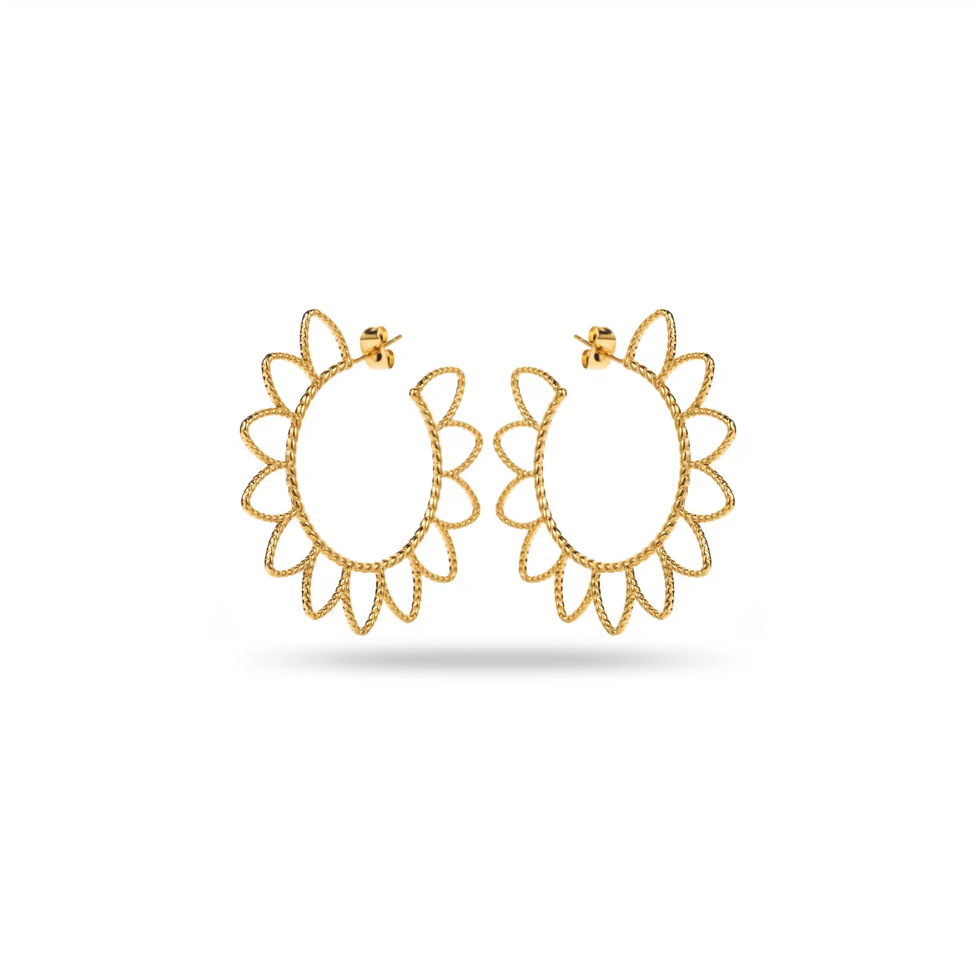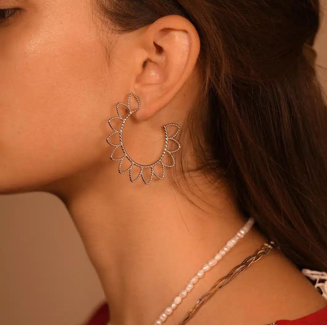 - Boucles d’oreilles en acier inoxydable, créoles très travaillées représentant une grande fleur
