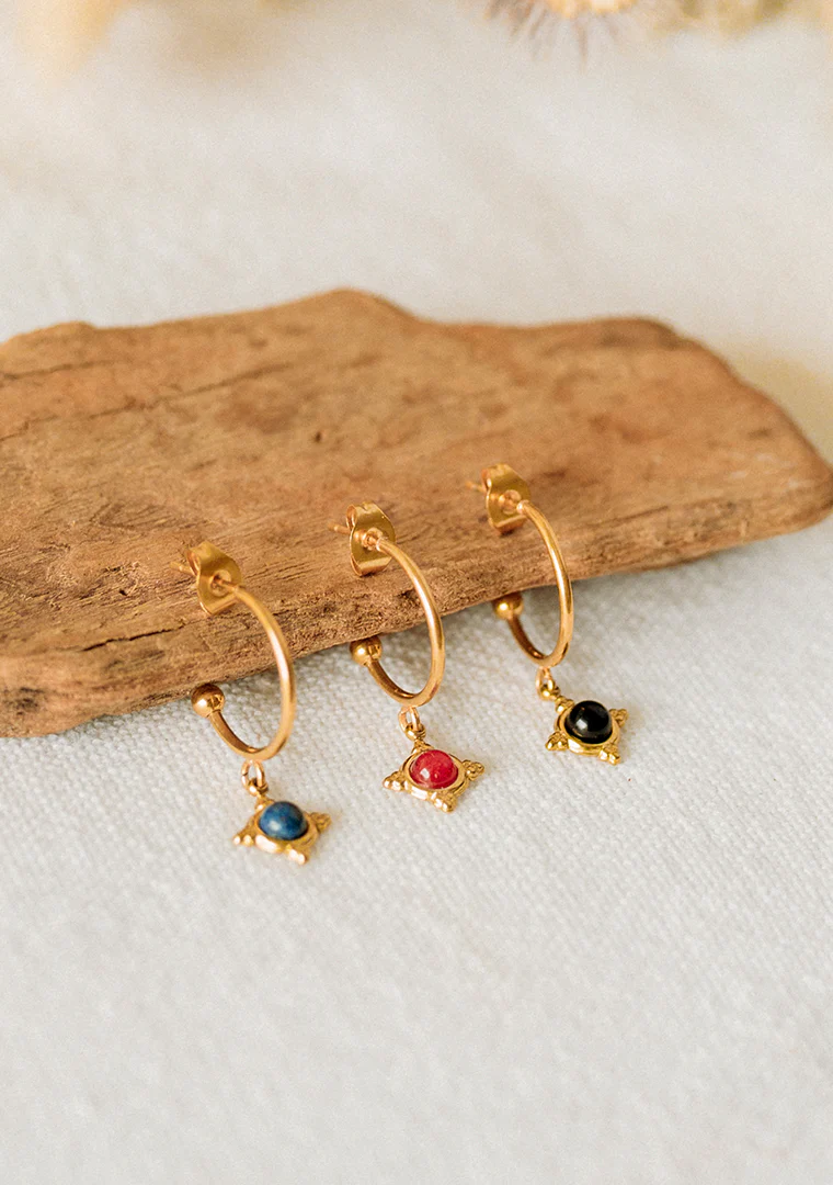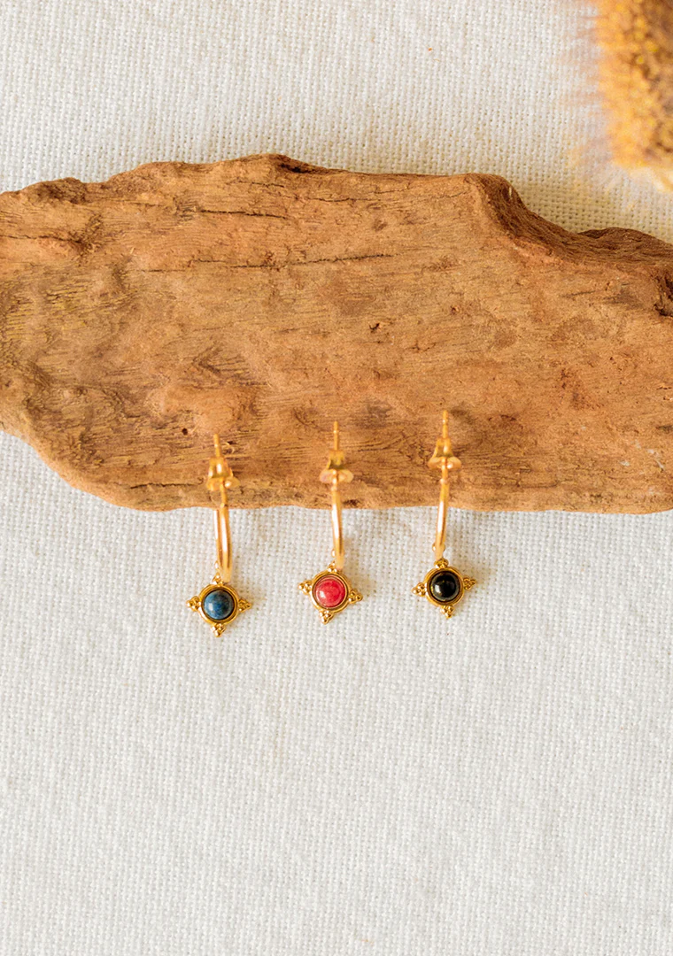 Les mini créoles Lucie sont fabriquées à la main dans mon atelier, Elles sont décorée d’une médaille incrustée d’une pierre dont la couleur est au choix :