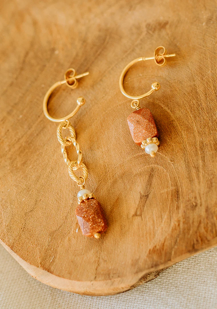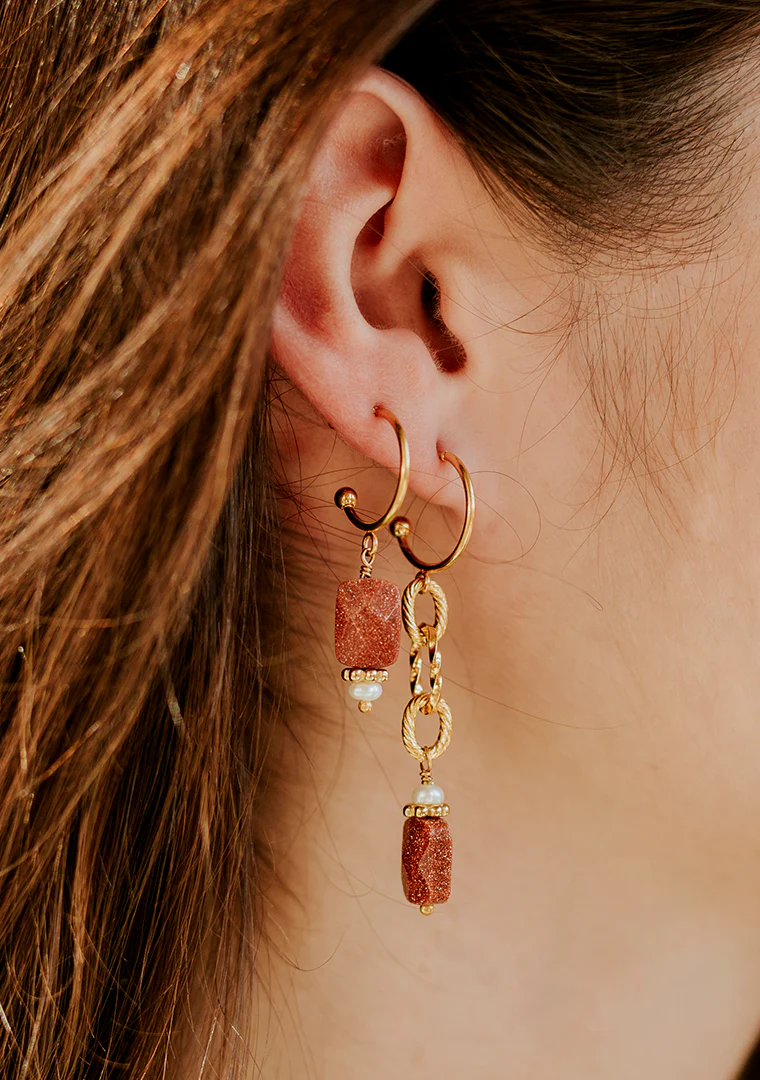 Les mini créoles asymétriques Théa sont fabriquées à la main dans mon atelier, Elles sont composées d’une chaine aux maillons asymétriques, de Perles d’eau douce, de Pierres de soleil couleur ocre aux multiples reflets pailletés,