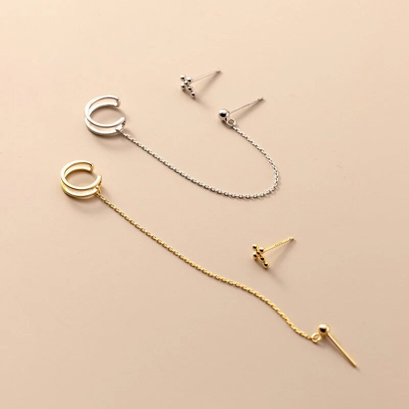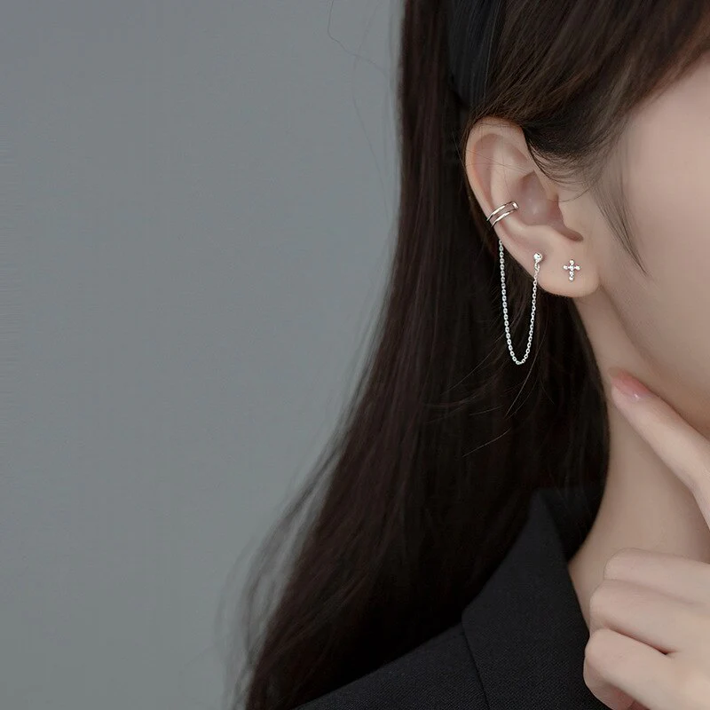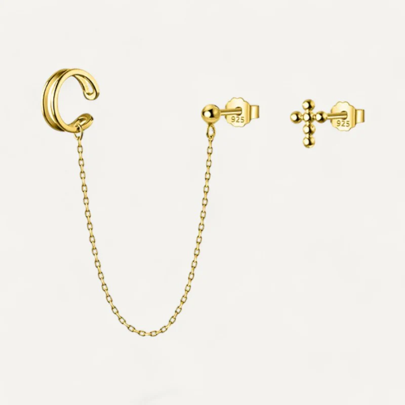 Chaque boucle présente une conception unique : d’un côté, une boucle élégante avec une chaîne délicate qui pend gracieusement, et de l’autre, une croix discrète qui évoque une signification spirituelle profonde.