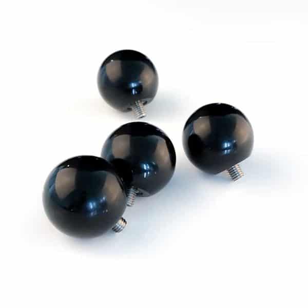 Boule noire brillante en de 40mm de diamètre équipée d’une vis en inox pour insérer dans vos plateaux.