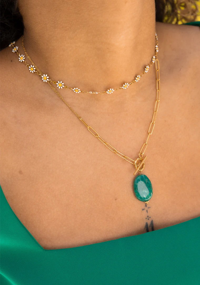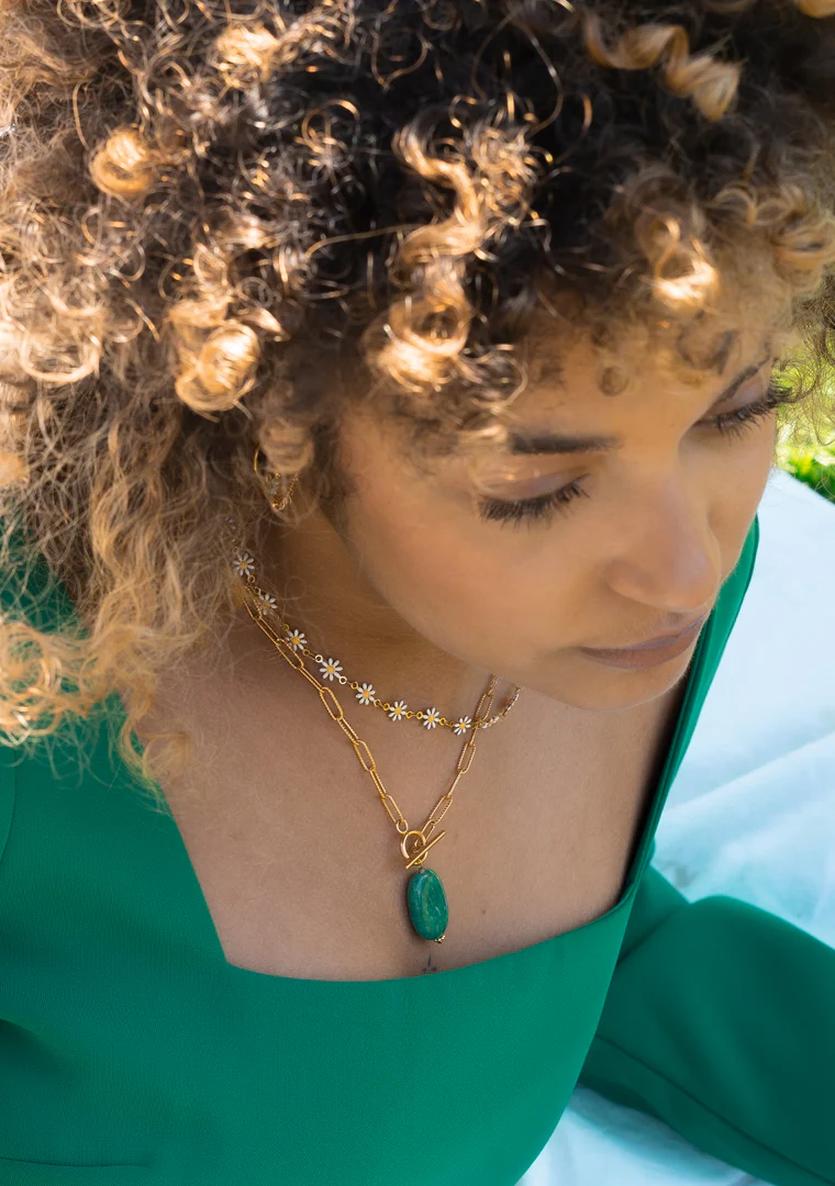 Le collier ras de cou Daisy est fabriqué à la main dans mon atelier. Il est composé d’une chaîne décorée de petites fleurs émaillées blanc et jaune.