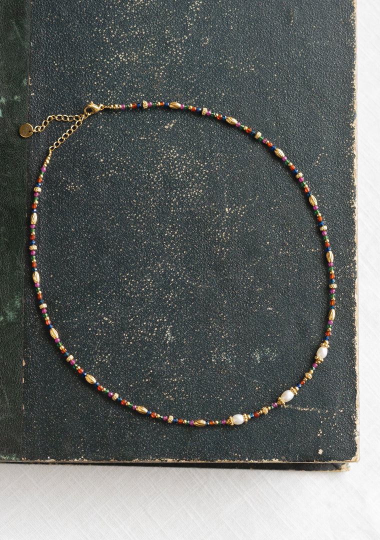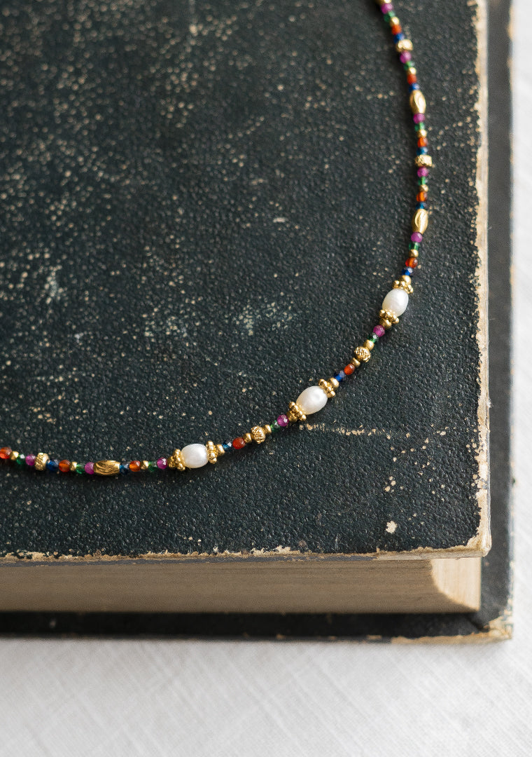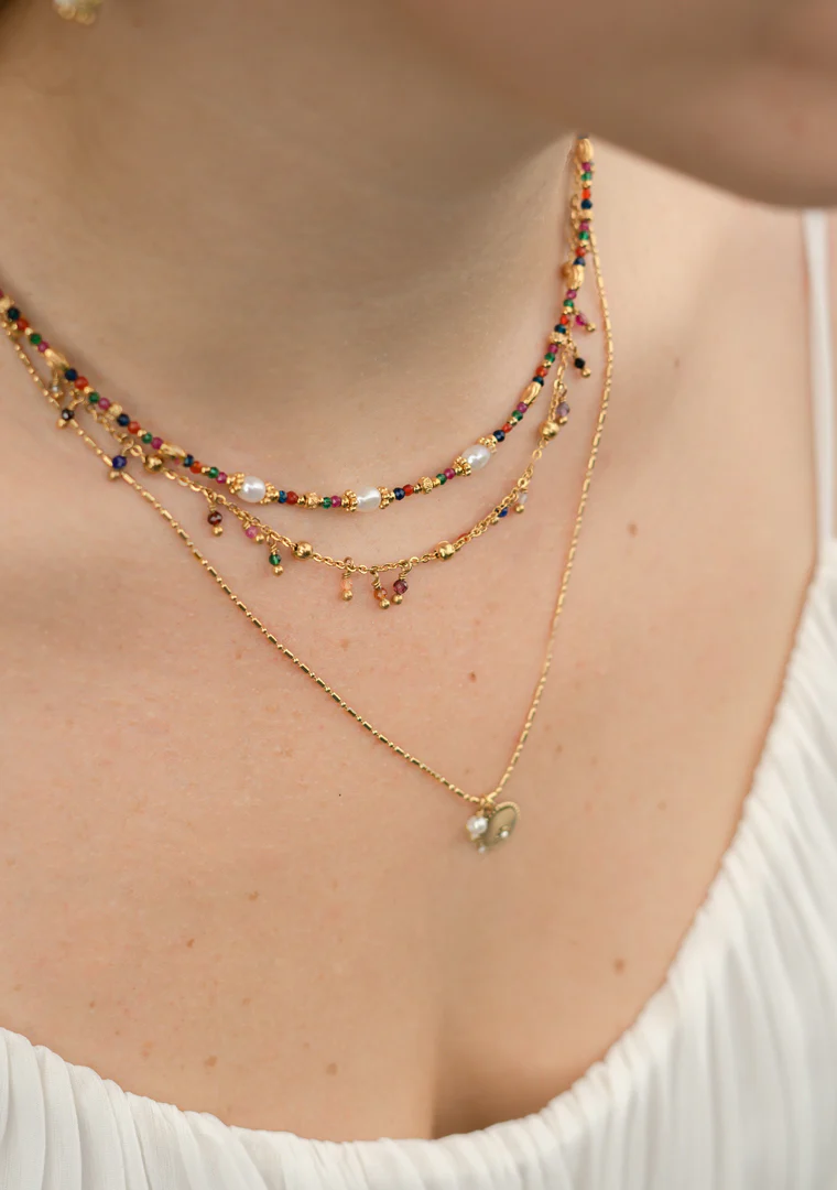 Le collier ras de cou Gaïa est fabriqué à la main dans mon atelier, Il est composé d’une multitude de pierres semi-précieuses multicolores, de perles d’eau douce et de perles dorées,