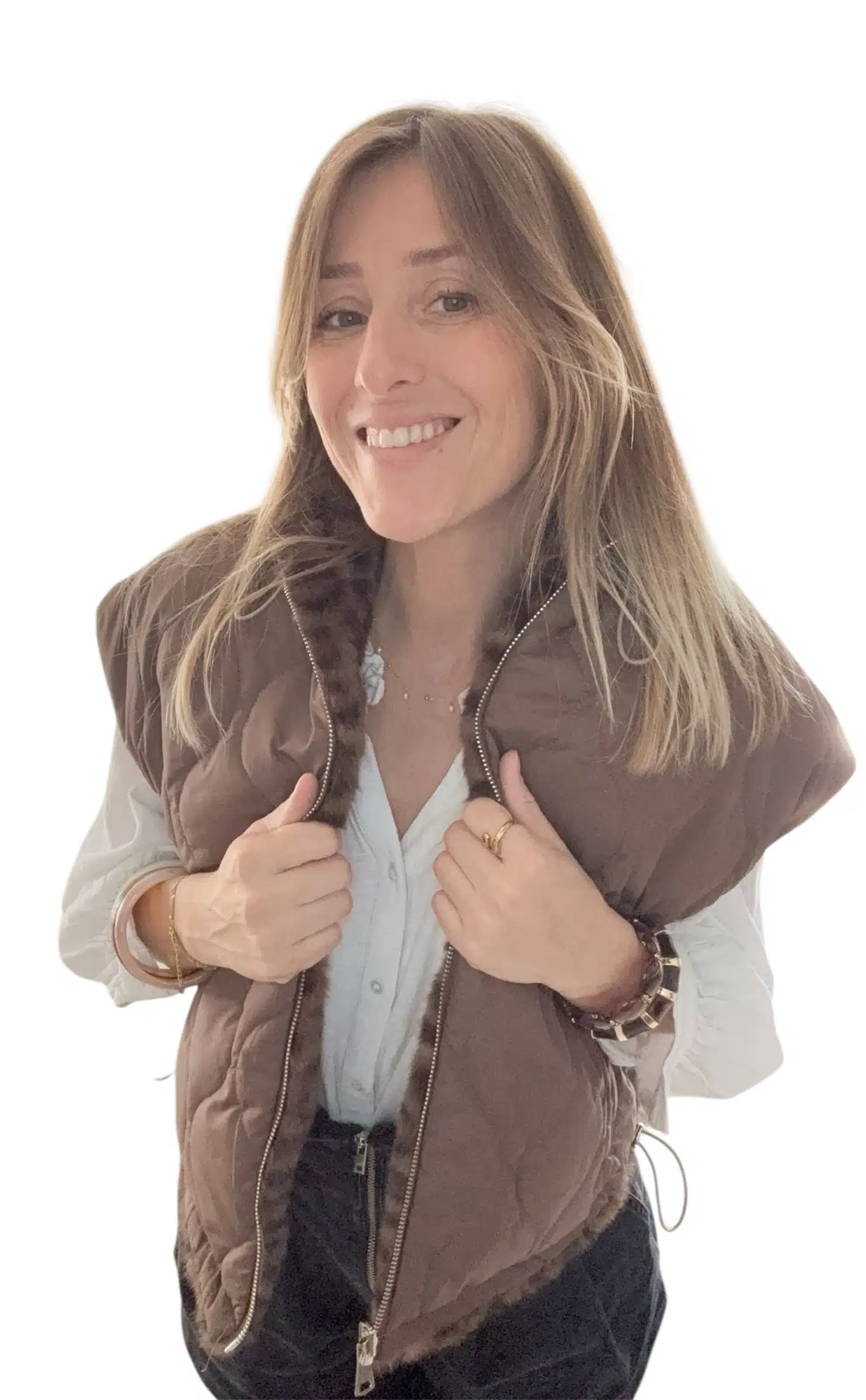 - Veste imitation fourrure réversible: un côté en fourrure léopard, un côté matelassé marron